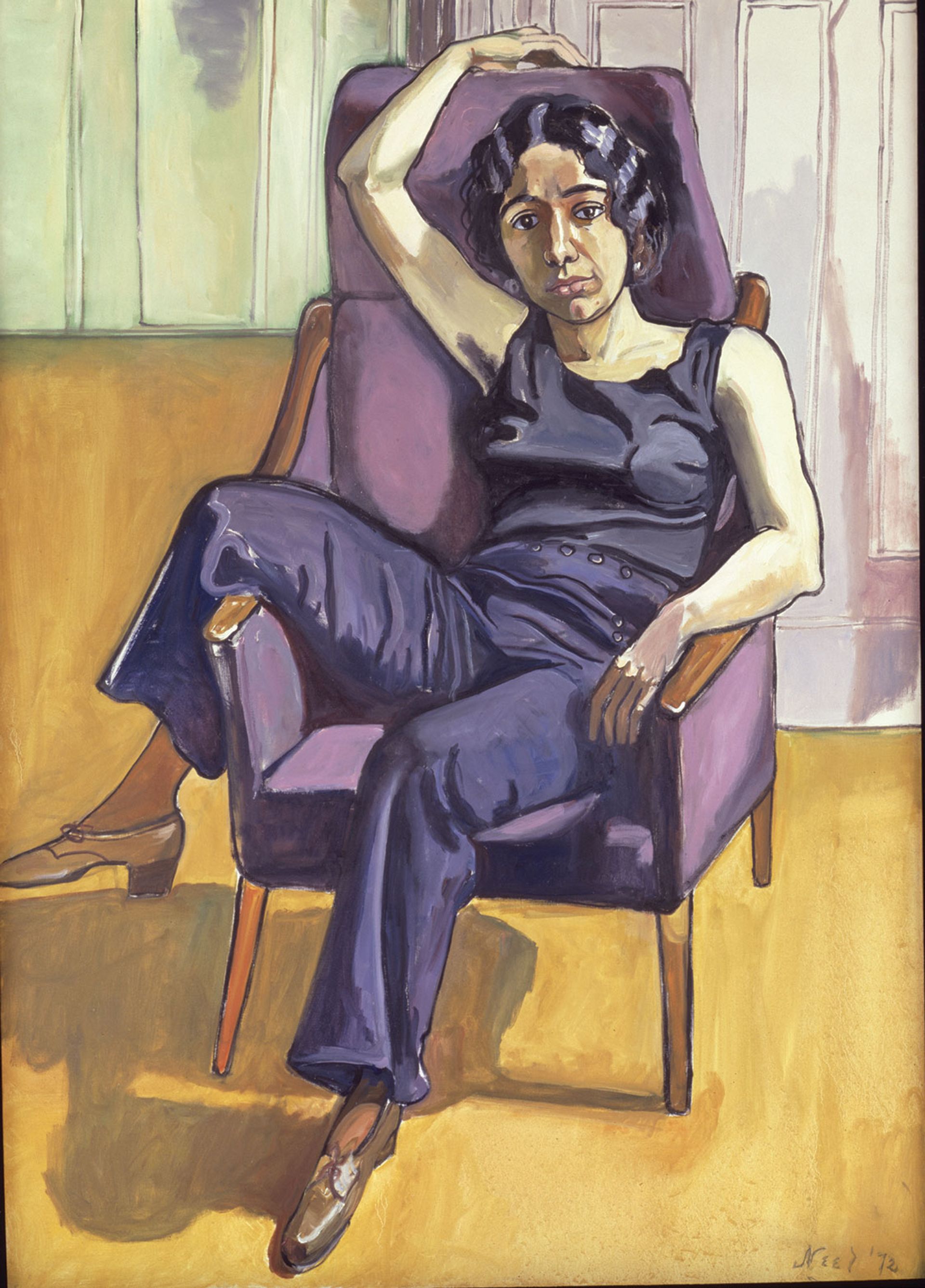 The subject of Alice Neel’s painting Marxist Girl (Irene Peslikis) (1972)—a founder of the New York Feminist Art Institute—presides over a worn purple chair like a self-possessed sovereign of bohemia. Peslikis’s right leg hangs over the armrest while her curling right arm shows off an unshaven armpit. Those brownish-black eyes confront us with a glare that is vulnerable yet not uninviting, as though she is too afraid to ask: “who the hell are you?” To her left, affixed on a blue wall under the vaulting industrial pipes of the Centre Pompidou is the double portrait Wellesley Girls (Kiki Djos ‘68 and Nancy Selvage ’67) (1967). In their preppy skirts and tights, painted under a harsh fluorescent light on a weekend trip to the city, they display the essence of middle-class naivety while social revolution rages outside.