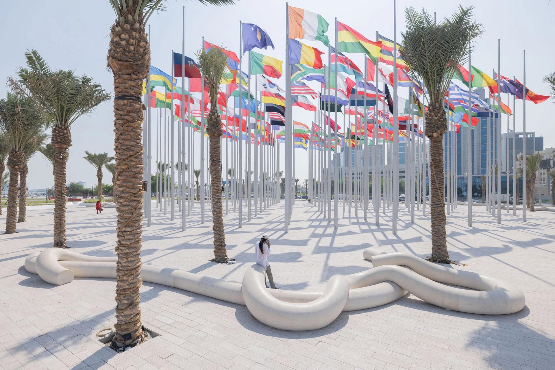 Lebanese artist Najla El Zein worked through the pandemic with a team of stone carvers in Beirut to produce this site-specific installation stretching for more than 300 metres around Doha’s recently created Flag Plaza. The sinuous, interlacing limestone forms reflect ideas of human connection and collectivity and double up as public benches, inviting people to rest and gather.