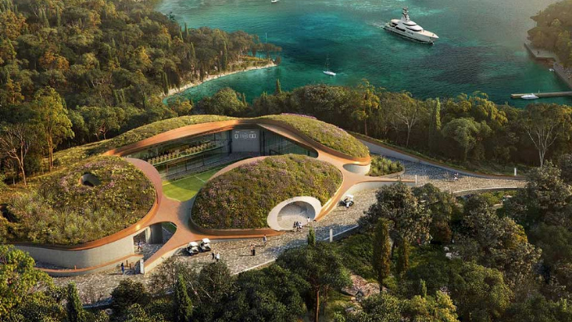 The island is said to be aiming to be totally self-sufficient. It has an electricity generator, water treatment and first aid facilities, with a farm that produces fruit, vegetables, wine and olive oil. Another key selling point is the promise that, in Flinders’s words, “the hotels and the villas are also being built underground as much as possible and covered with trees, so as not to spoil the green beauty of Skorpios”.