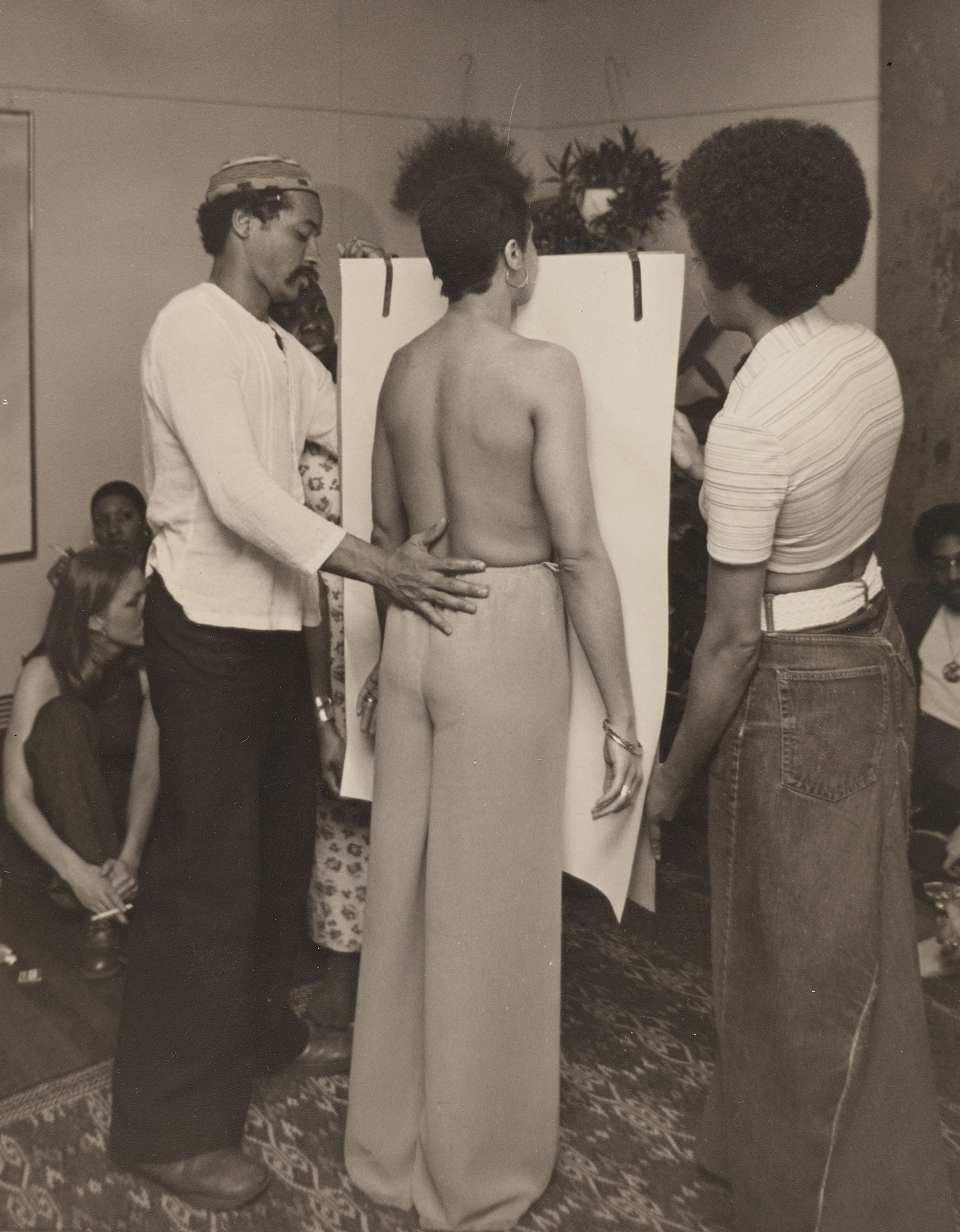David Hammons (left) and Suzette Wright (centre) at the Body Print-In held in conjunction with Hammons’s exhibition Greasy Bags and Barbeque Bones; Philip Yenawine’s home, 1975. Photo: Jeff Morgan; Courtesy of David Hammons; Collection Linda Goode Bryant, New York