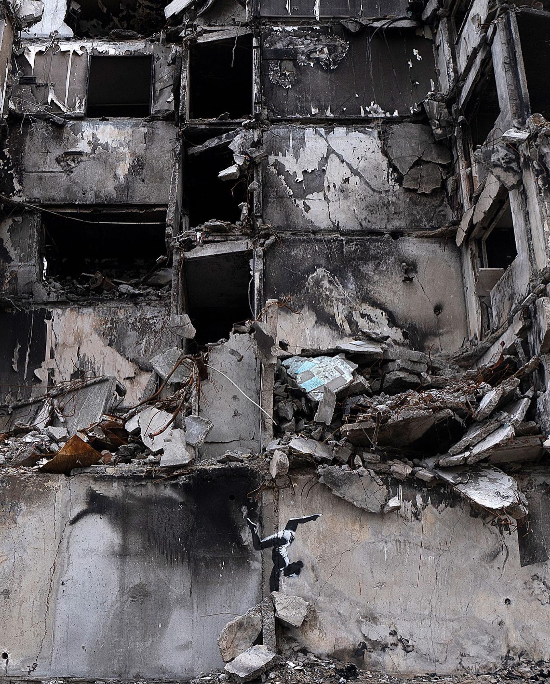 Speculation had been mounting that the anonymous artist was in the war-torn country after three works were spotted last week. One mural depicts a man said to resemble the Russian president, Vladimir Putin, being thrown to the floor during a judo match with a young boy—Putin holds a black belt in the sport. Another work shows two children using a metal tank trap as a seesaw, while a third mural, painted within the ruins of a bombed building, is of a gymnast doing a handstand.