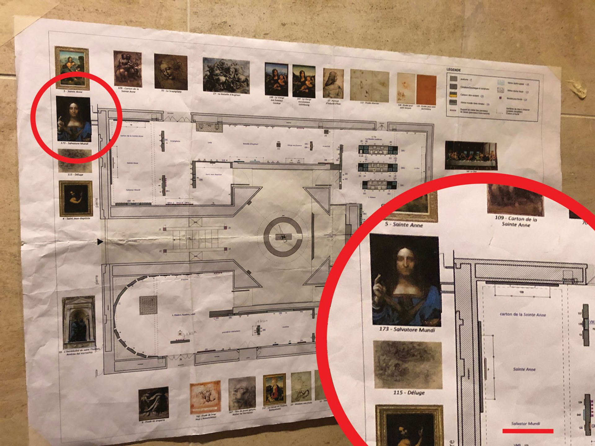 A photograph sent to The Art Newspaper of the original Louvre ground plan for the 2019 exhibition demonstrating that the painting was intended to be part of the show. The plan was removed from the Louvre's exhibition hall at the last minute on the day of the advance press preview