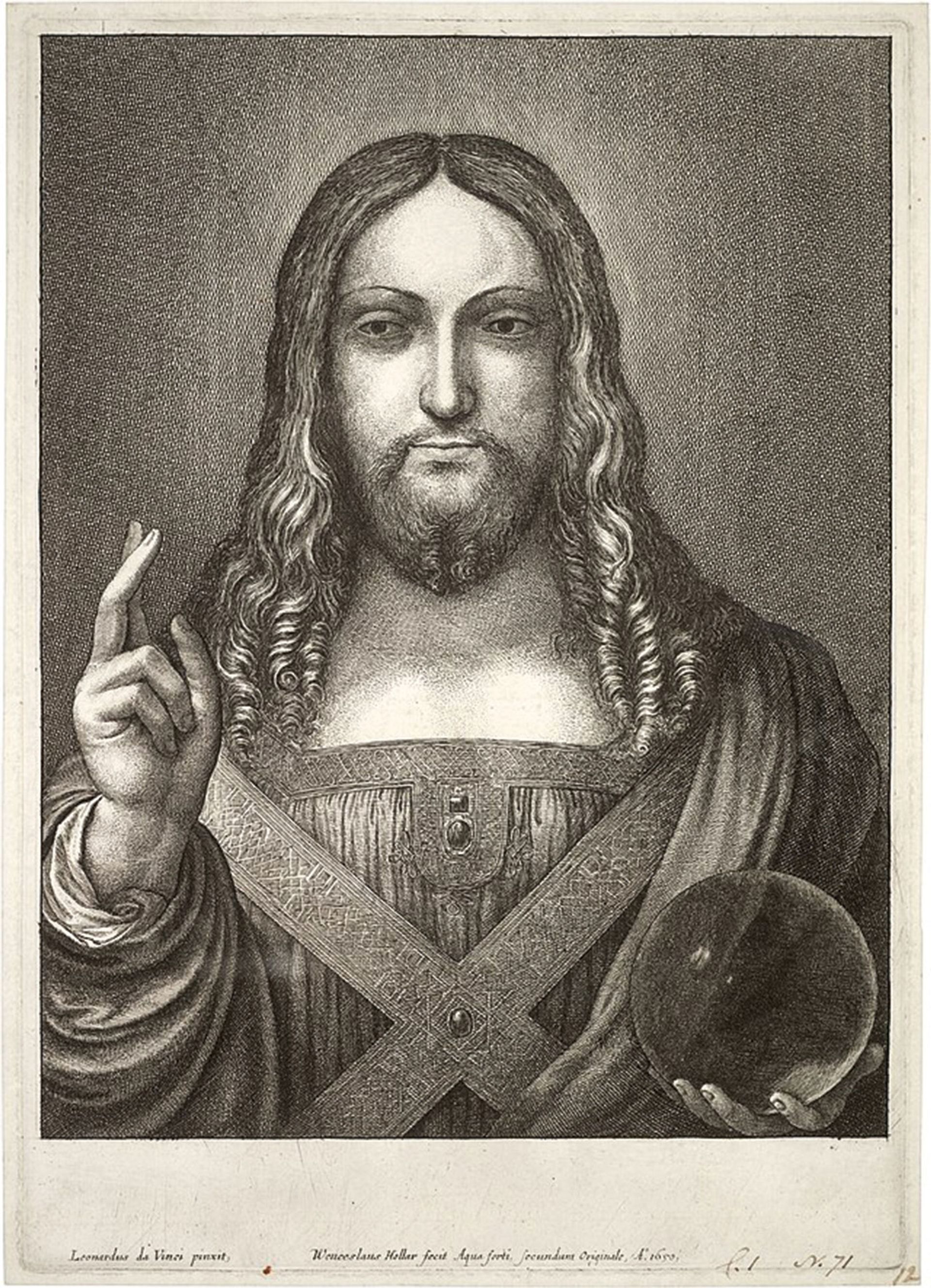 Etching of a Salvator Mundi inscribed (in Latin): “Leonardo painted it” and that Wenceslaus Hollar etched it “from the original” in 1650. Although often compared with the Saudi Salvator Mundi, it has a full beard and a moustache Thomas Fisher Rare Book Library; Toronto