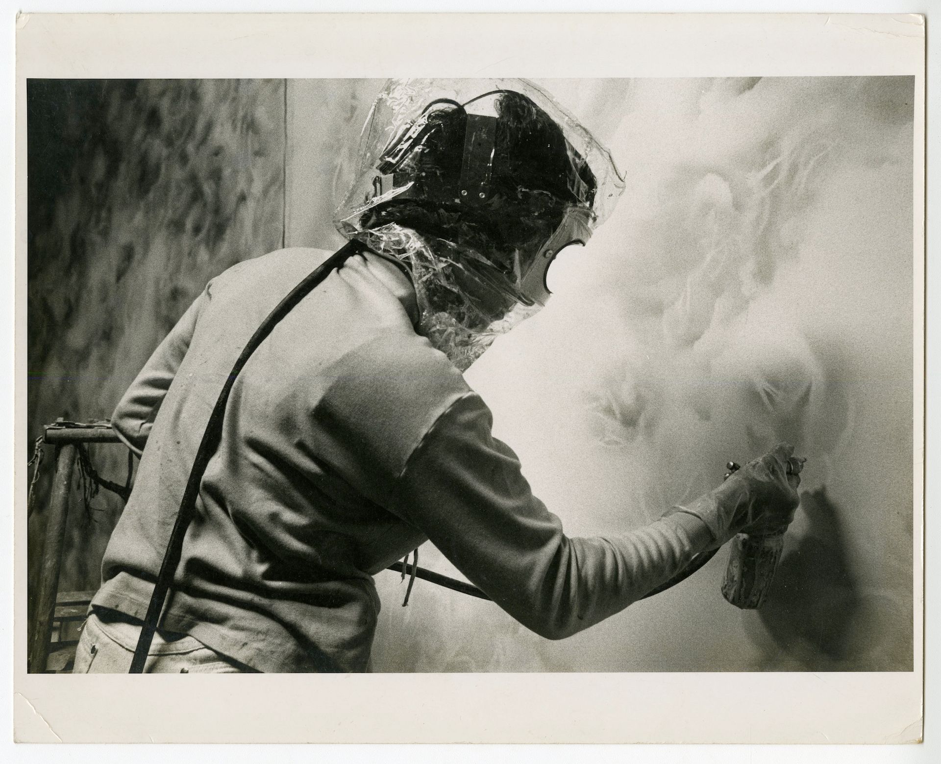 Sheila Isham painting with an airbrush in Washington, DC, in the early 1970s. Photographer unknown, courtesy of the Sheila Isham Archives, New York City