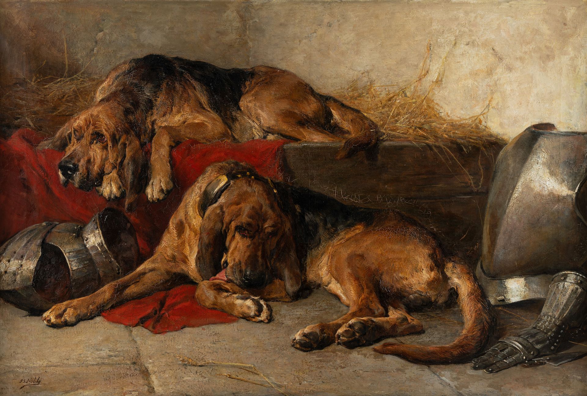 The dog paintings will go on offer at Hindman’s American and European Art auction in Chicago on 7 December. The sale will be highlighted by John Sargent Noble’s Off Duty (1891), a wonderfully laconic portrait of two bloodhounds lounging upon a suit of armor that carries an estimate of $50,000 to $70,000. Other highlights include Clio (1839) by John Fredrick Herring the Elder, a popular painter of horses and hounds with the English gentry, on offer for $60,000 to $80,000; Alexander Pope’s English Setters (1891), which carries an estimate of $50,000 to $70,000 and Maud Earl’s cozy group portrait Four Friends (1893), with an estimate of $30,000 to $50,000.