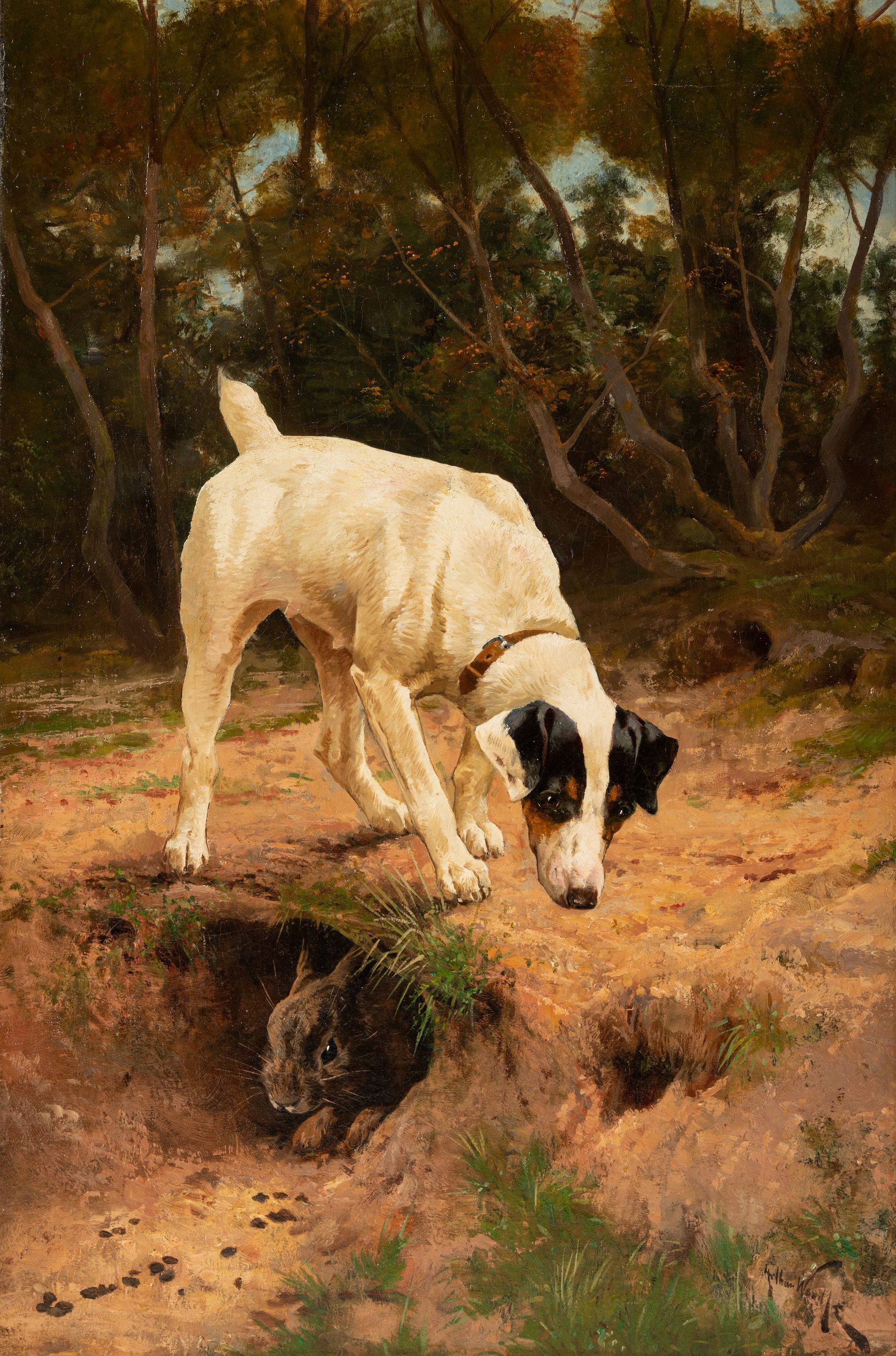 Scaife’s collection offers a uniquely holistic view of a style of painting that thrived during the 19th century. “Increasing numbers of people began to have the time and money to take the dog beyond the role of companion and to make it a creature to be exhibited publicly and for the scrutiny of others,” according to a Hindman catalogue essay, and that newly reconfigured relationship led to an explosion of paintings featuring furry friends. The paintings could range from straightforward portraits, such as Herbert William Weekes’s diptych Pet Dogs (1879, est $1,500-$2,000), to sentimental scenes like Earl’s Four Friends and more virtuoso, technical displays of hunting ability, as seen in Edwin Armfield’s Two Hounds Chasing a Pheasant (est $1,000-$1,500) or Arthur Wardle's Look Out! (1885, est $10,000-$15,000).