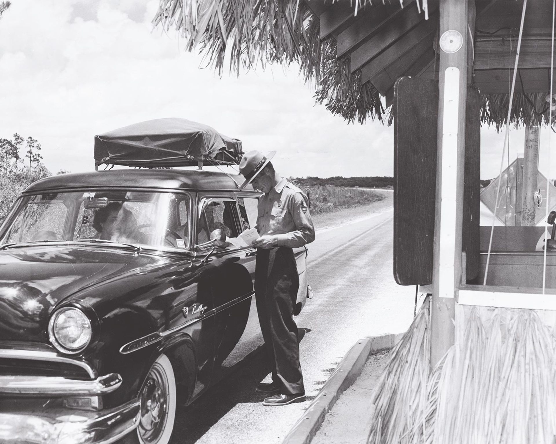 By the mid-1950s the National Park Service had paved the Ingraham Highway and begun collecting entrance fees at this thatch-roofed entrance station.