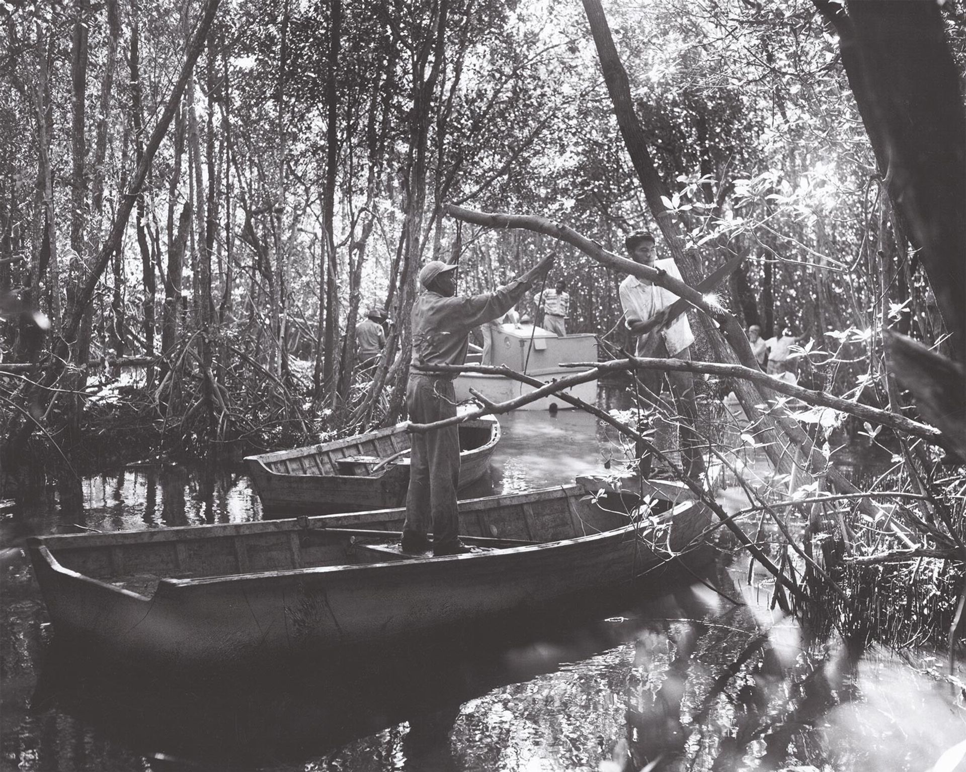 Seminole foreman Corey Osceola (centre) and his team use small skiffs to clear a path for the Halfway Creek boat tour trail in the 10,000 Islands area of the park.