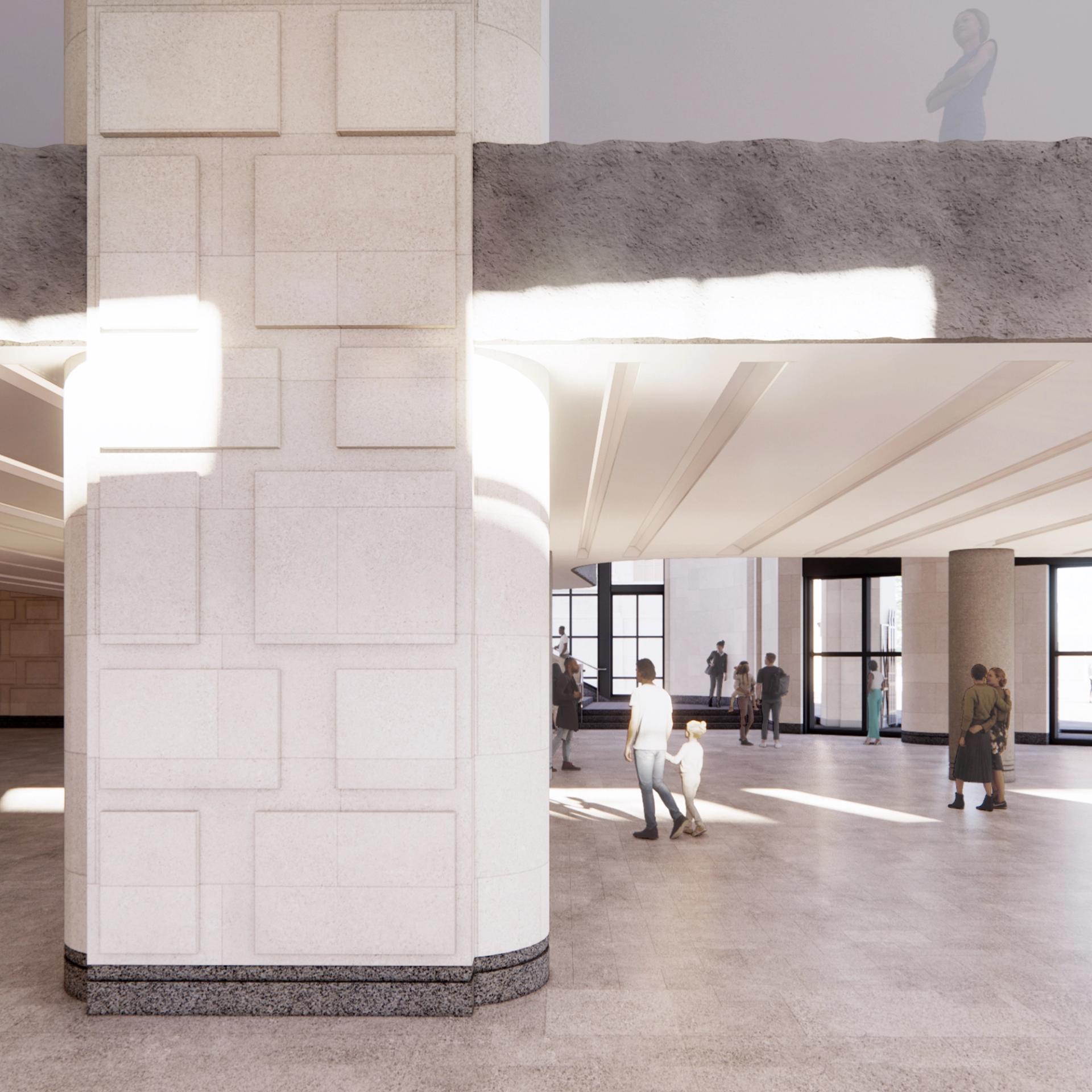 In October, Selldorf submitted revised plans to remodel the wing's interior. Selldorf’s current plan, part of the NG200 project, involves remodelling the gallery’s front gates and the ground-floor entrance, stairs and lobby. Egyptian-style pillars will be relocated to make way for a new retail space, while parts of the ceiling will be removed to allow in more natural light.
