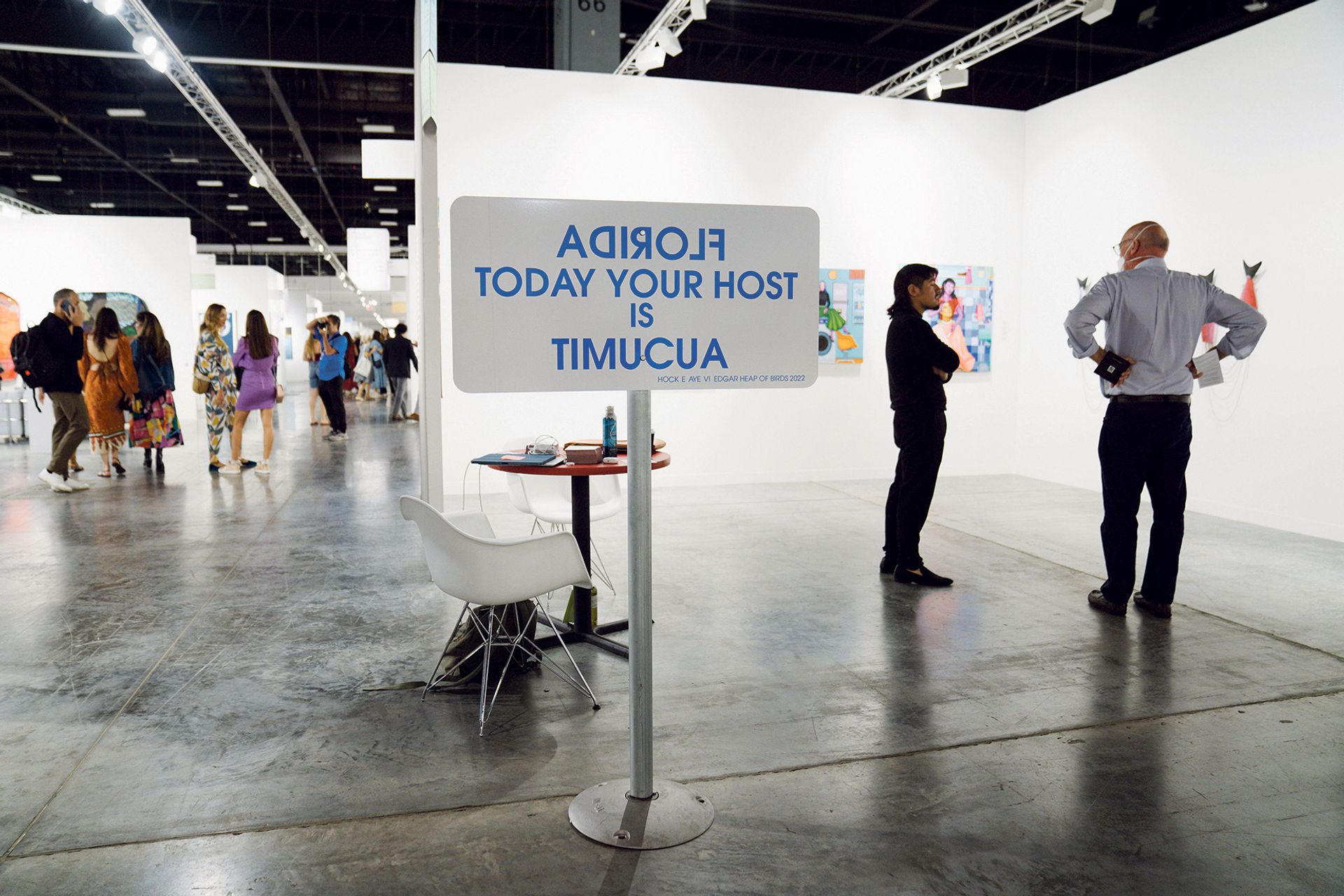 Indigenous artist Hock E Aye VI Heap of Birds’s (Cheyenne and Araphaho) Florida Today Your Host is Timucua (2022) is one of a series highlighting the issue of Native American land rights Eric Thayer
