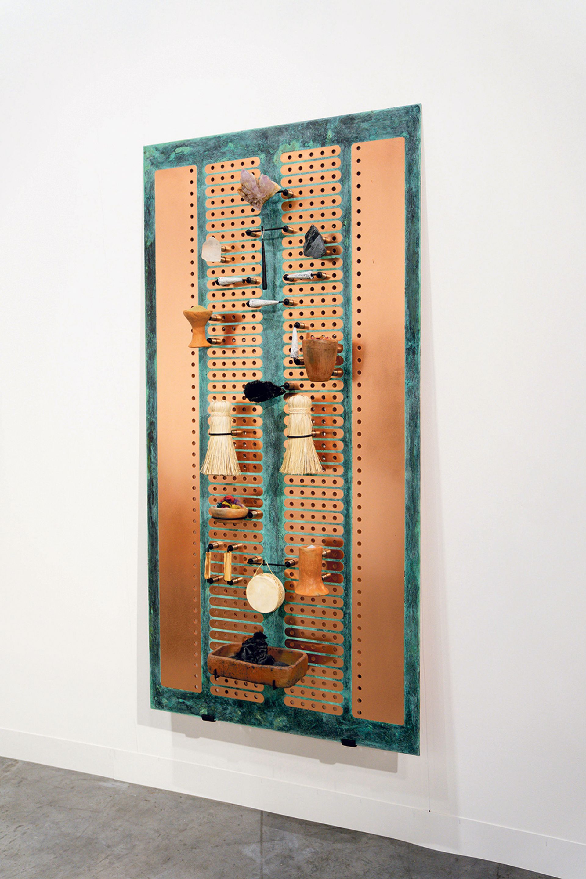 “What she’s doing here is playing with the idea of a circuit,” Hakel says of Peruvian artist Garrido-Lecca’s wall sculpture, based on a schematic from an electrical engineer. “But what’s producing the energy are all these ritual objects and different minerals like gold and quartz. It’s trying to reconnect with the past from the colonial perspective, in these countries that have this very whitewashed history of the erasure of Indigenous people.”