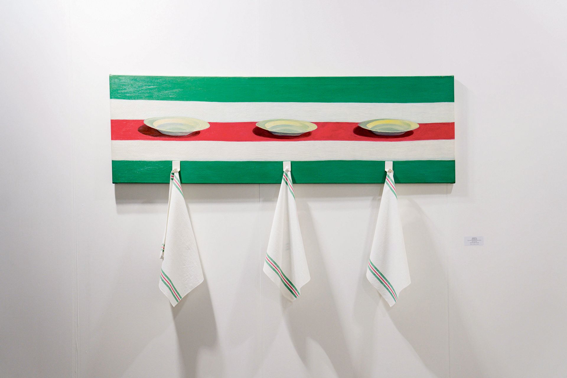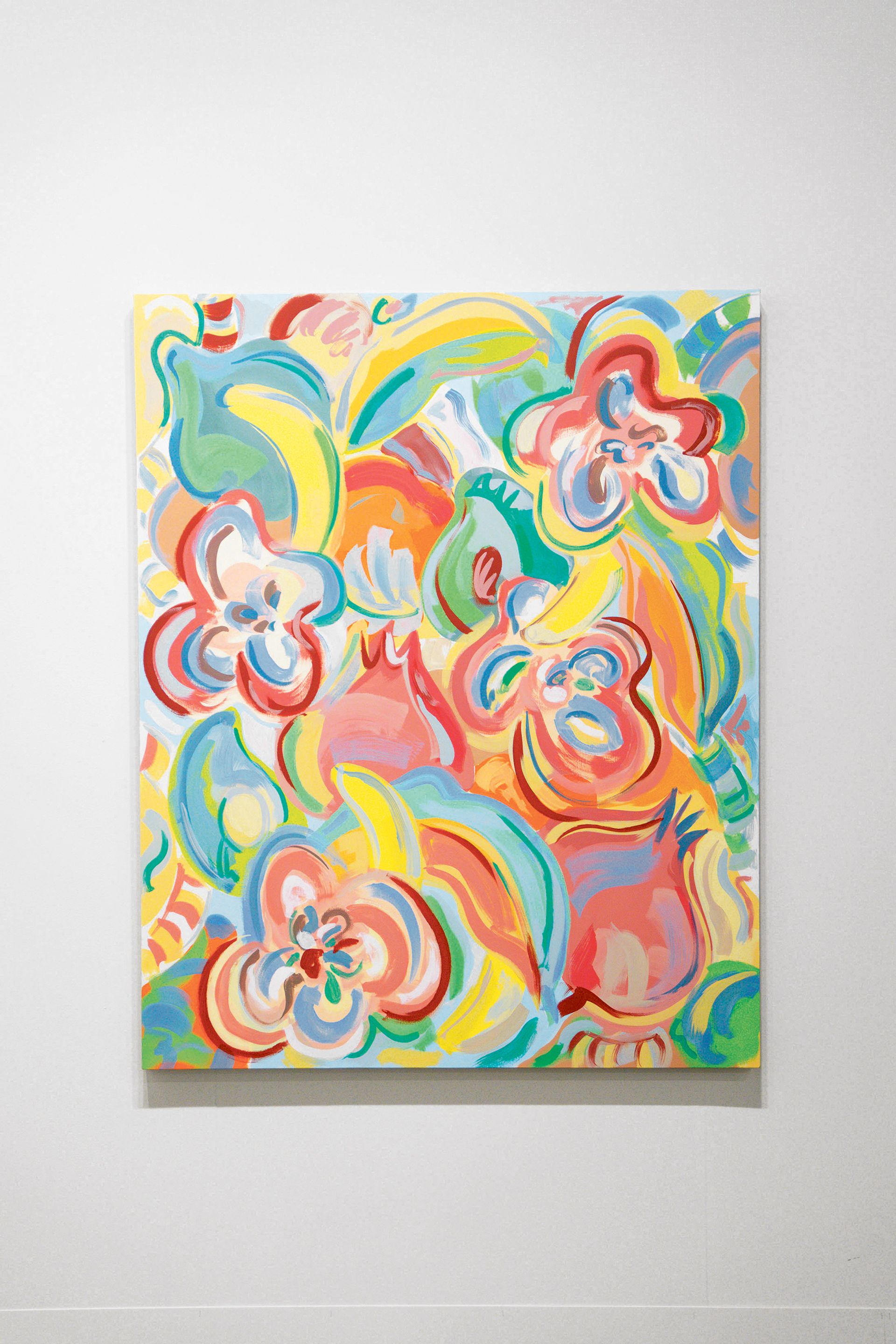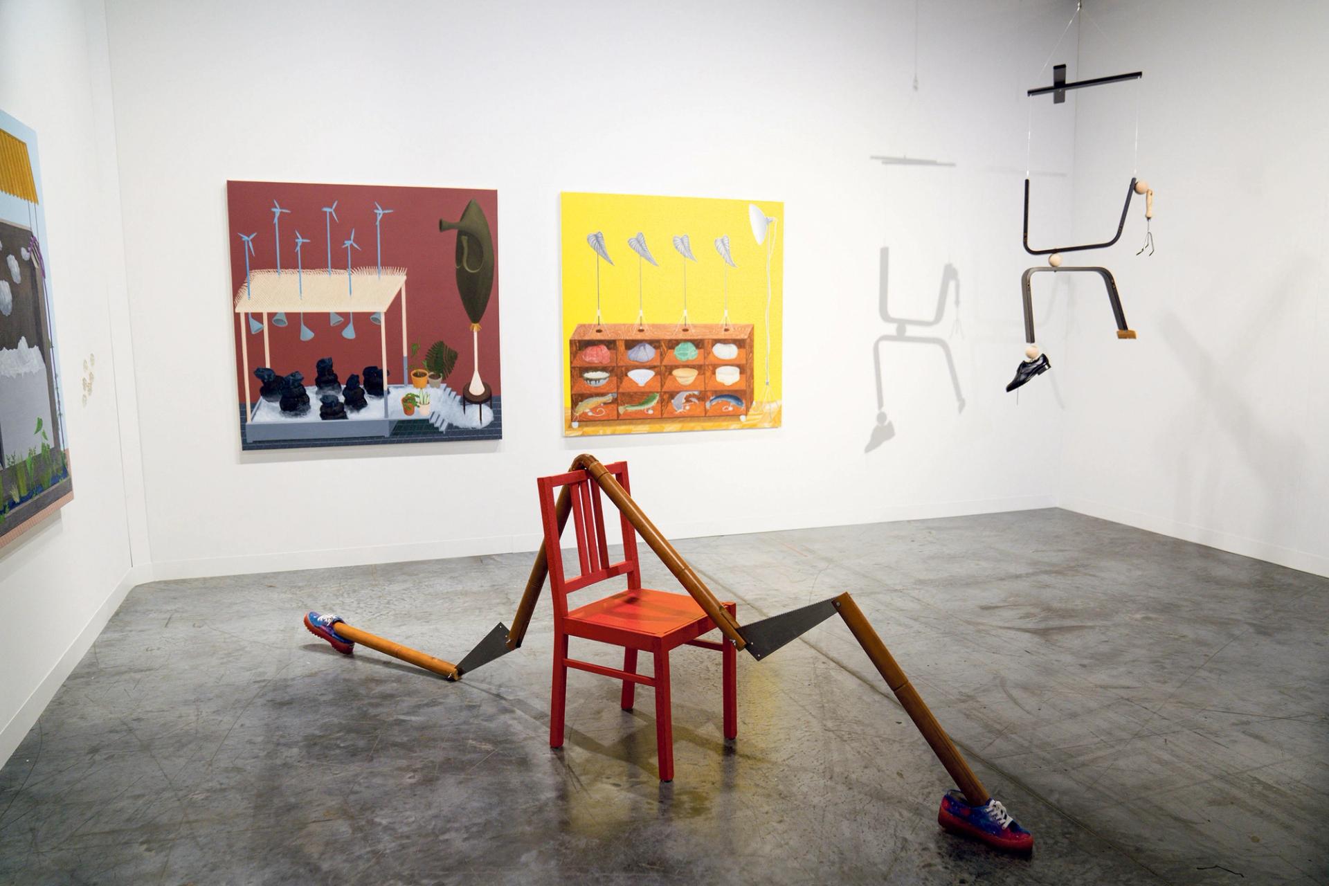 The Venezuelan-born, Berlin-based artist Calero creates complete environments that critique stereotypical images of the Caribbean—loud, bright, and brash. The paintings at Art Basel are part of these larger installations. “They are like a souvenir of the environments,” Hakel says.