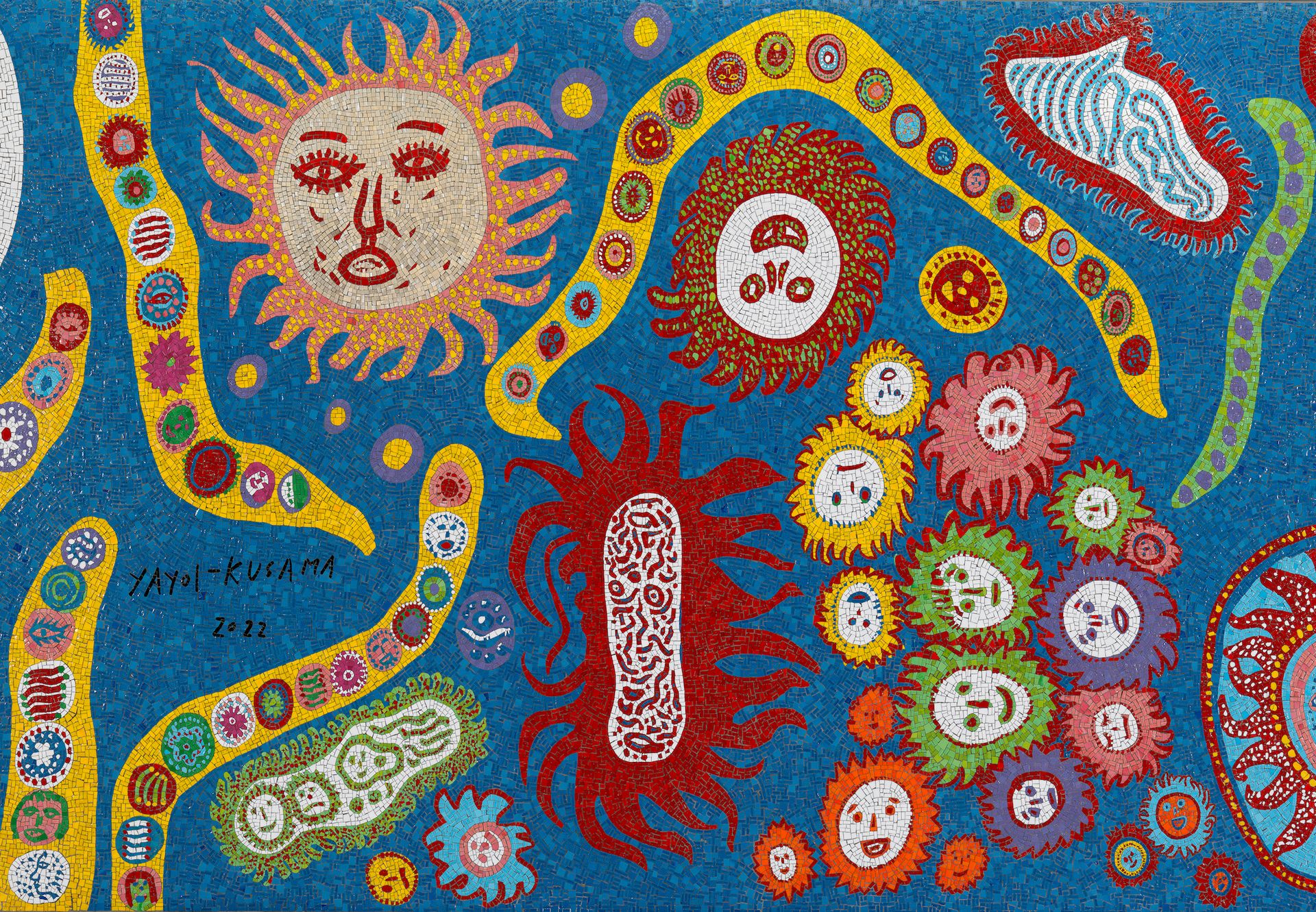 Kusama 875-sq.-ft mural, A Message of Love, Directly from My Heart Unto the Universe (2022), includes many of her trademark icons, including spotted and patterned figures, stylised suns and smiling faces. The artist, who is in her 90s and lives in Japan, realised the commission from afar. In an accompanying poem, she wrote: “My wish is to deliver this vision, with all that is my life, to the people of New York.”