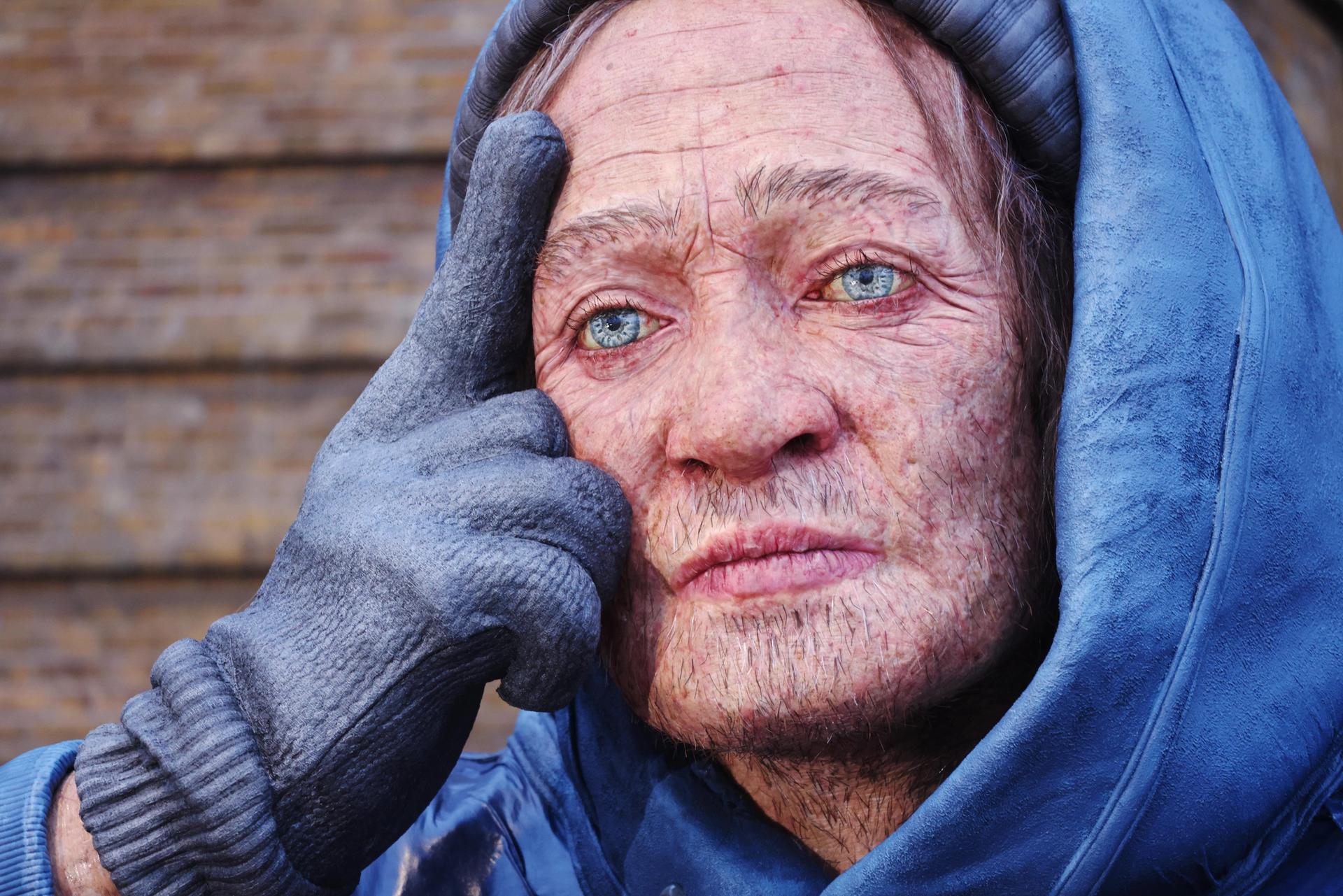 The sculpture was created by the artist and prosthetic expert Sophie de Oliveira Barata and the artist Helen Lansdown (in collaboration with the creative agency Creative Giants and design company Millimetre). Called Alex, it was made using face-mapping technology and the profiles of 17 people facing homelessness “who have been supported by Crisis,” the charity says in a statement. The resulting figure is life-like, ethnically ambiguous and androgynous. The composite modelling approach was used to create a work representing the universality of the crisis and free the art from "biases of what homelessness looks like," Ben Kearns, design director of Creative Giants, tells The Art Newspaper.