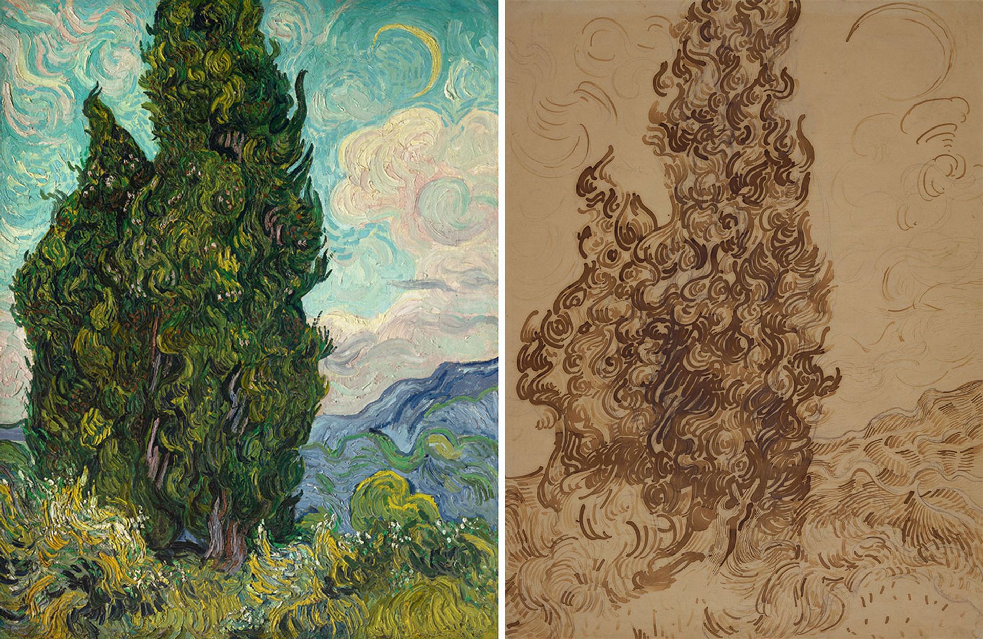 Van Gogh’s Cypresses (June 1889) and the drawing Cypresses (June 1889) Metropolitan Museum of Art, New York (Rogers Fund, 1949, 49.30) and Brooklyn Museum (Frank L. Babbott Fund and A. Augustus Healy Fund, 38.123)