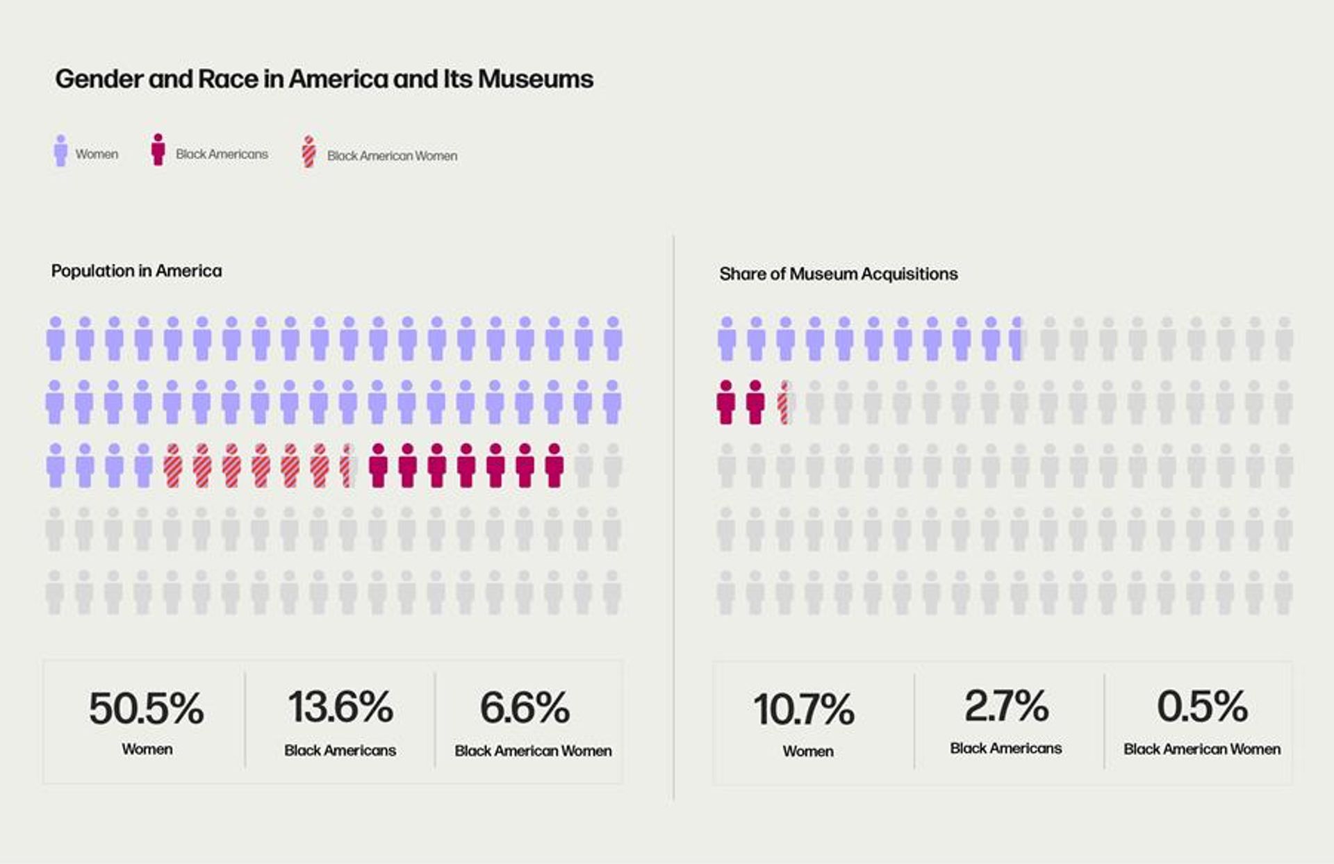 The study, conducted by the journalists Charlotte Burns and Julia Halperin for Artnet News and Studio Burns, found that works by female-identifying artists made up just 11% of acquisitions and 14.9% of solo and group exhibitions during that period. Works by Black American artists accounted for a mere 2.2% of acquisitions and 6.3% of exhibitions. These acquisition figures are roughly one-fifth of “what they should be if collections are to represent the population of the United States”, the authors write in a foreword. The situation is compounded for Black American female artists: comprising 0.5% of museum acquisitions, they are “underrepresented by a factor of 13” compared with the demographics of the US population.