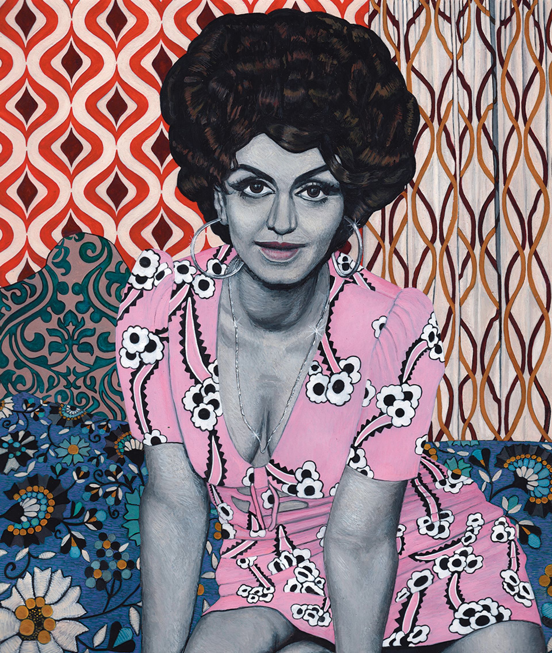 Pattern plays a prominent role in this exhibition, from the Islamic-style wall paintings to the mirrored stars on the monolith sculpture and the intensely detailed 70s-style patterns on the clothes and furnishings of the women in your paintings. But sometimes these women can also seem almost pinned down and subsumed by all the Western-style patterning that’s surrounding them.