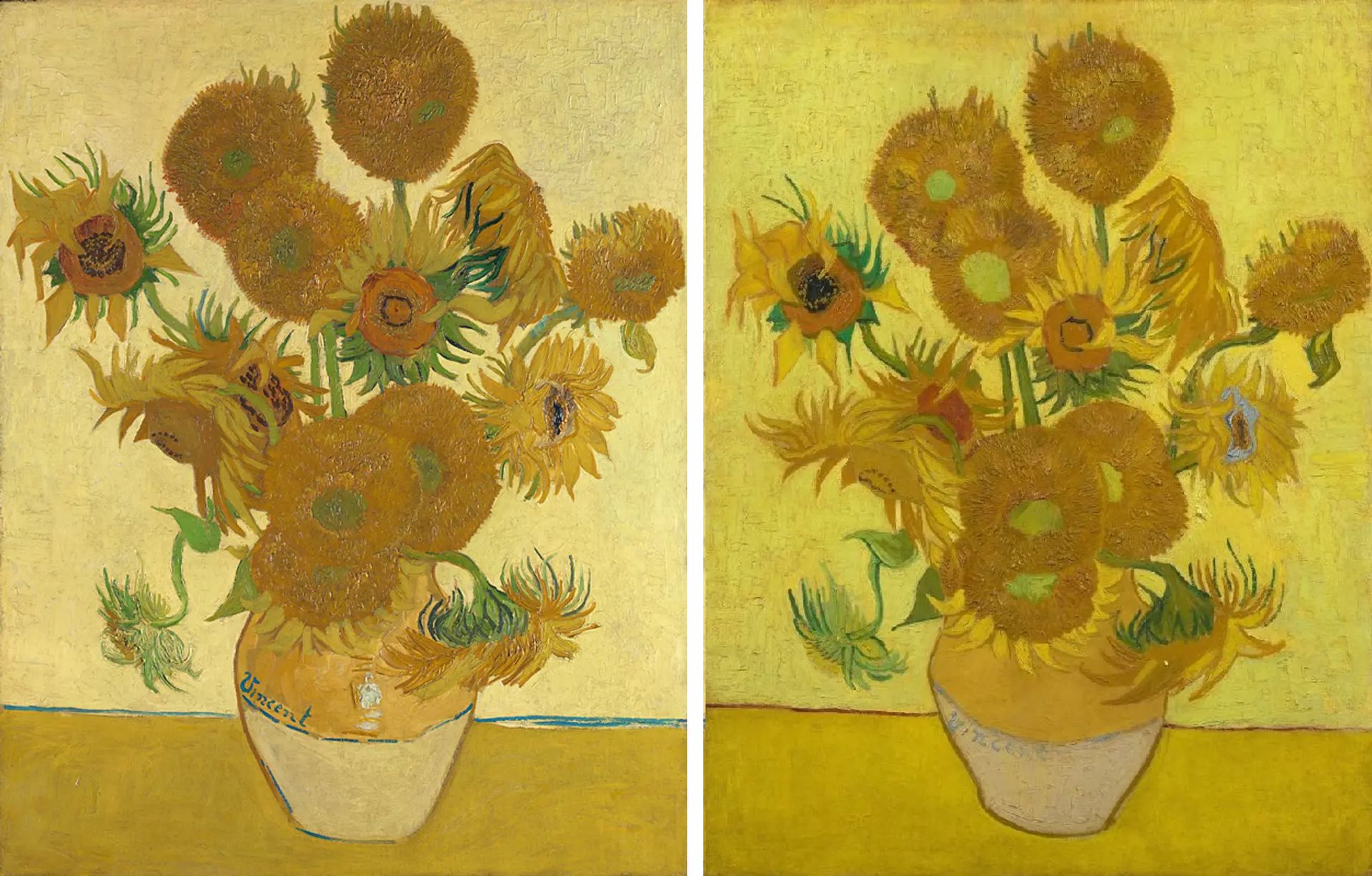 Van Gogh's original Sunflowers (August 1888) (left) and the signed copy of Sunflowers (January 1889) National Gallery, London and Van Gogh Museum, Amsterdam (Vincent van Gogh Foundation)
