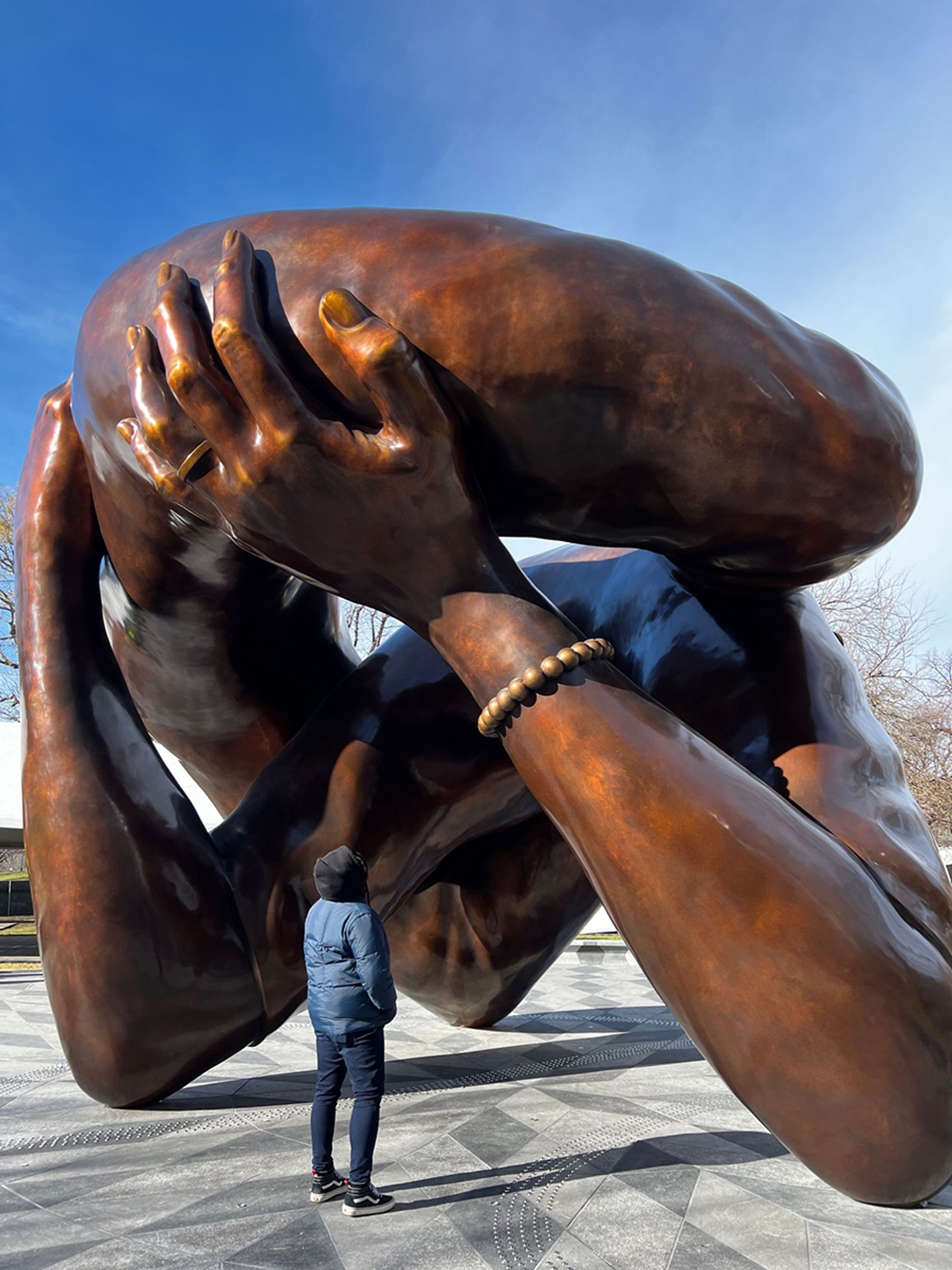 Installation view of Hank Willis Thomas's The Embrace (2023) at Boston Common Courtesy of the artist.