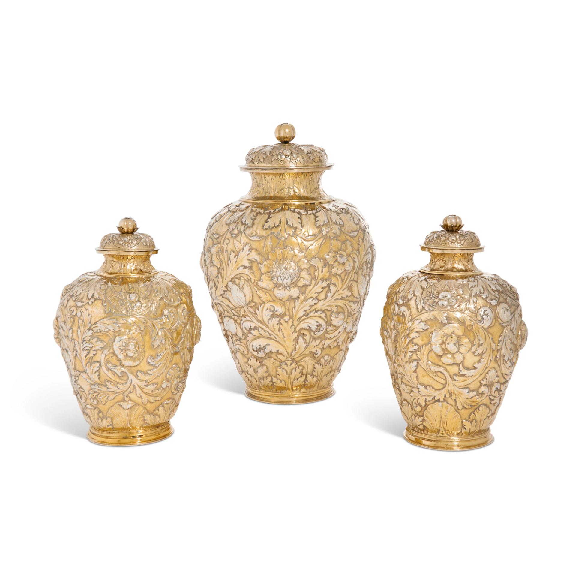Three Charles II silver-gilt furnishing vases and covers (around 1670-80)