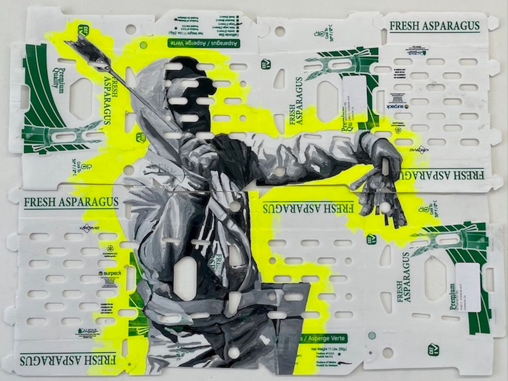 “Drawn from my own experiences as a farmworker, I pay homage to the people who toil in the fields picking the produce we consume,” the artist said in a statement. “I portray farmworkers on discarded produce boxes many times collected from grocery stores. This allows me to reflect upon the disparities of socioeconomic lifestyles, that of the farmworkers and agribusiness owners.”