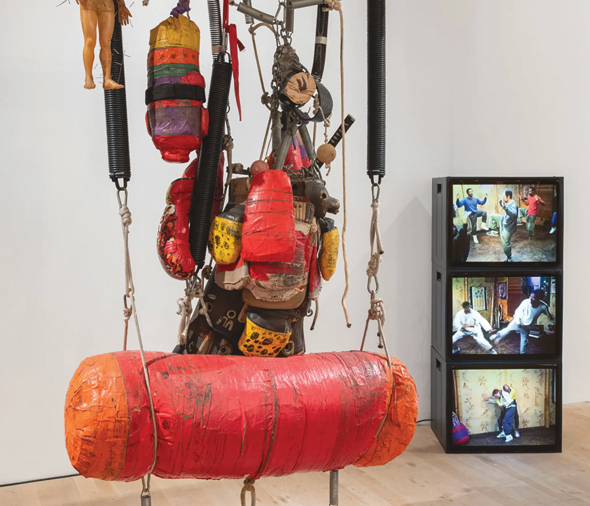 Yara Training Bag (around 1990) and Three Monitors with Yara Videos (around 1980s and 1990s) explore the African dance-inspired martial art invented by Milford Graves