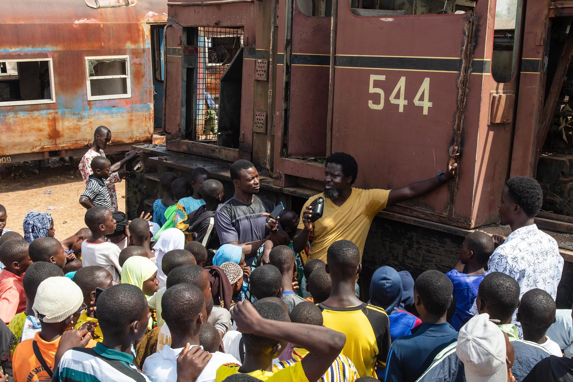 Ibrahim Mahama explaining his plans for the trains to a local audience Courtesy of Ibrahim Mahama, SCCA Tamale and Redclay