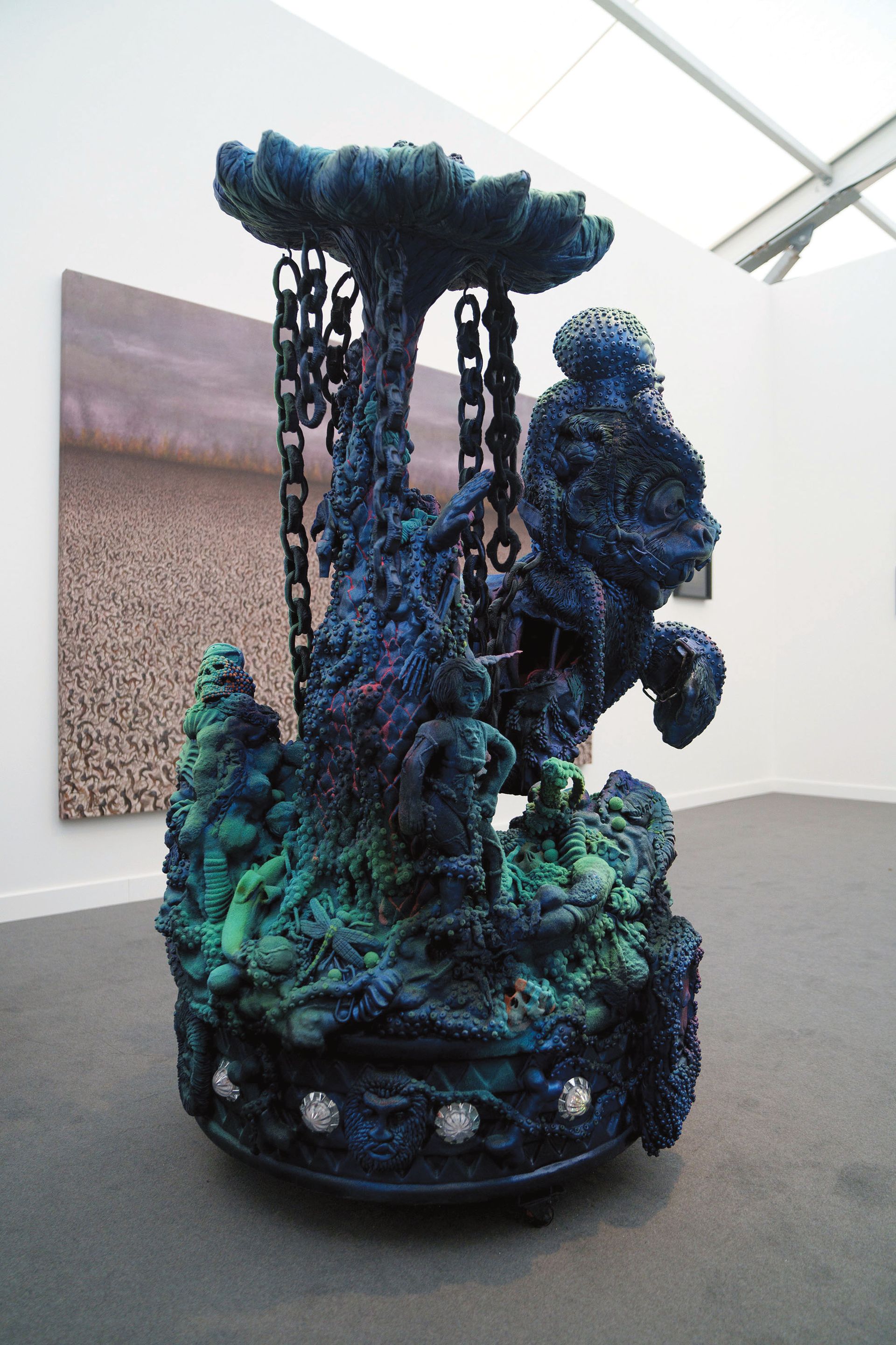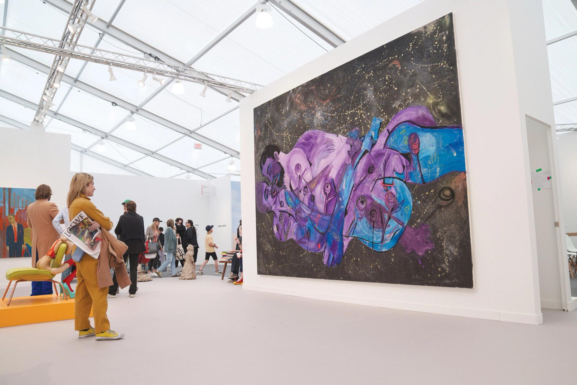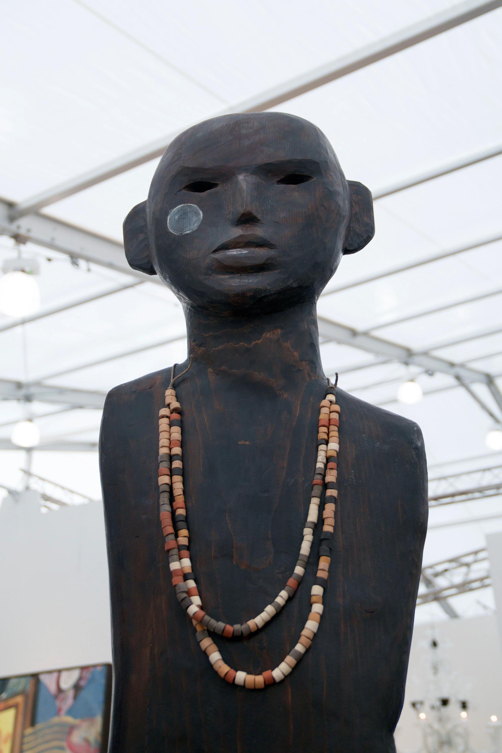 Frieze Los Angeles’s new digs on the Santa Monica Airport campus have afforded it plenty more room for large-scale works, not only outdoors near the tarmac, but also inside its spacious tent and the soaring Barker Hangar. Plenty of dealers have taken advantage of the fair’s ample real estate, bringing towering sculptures like Rose B. Simpson’s totemic figure carved from New Mexico pine on Jack Shainman’s stand, enormous canvases like Jonathan Lyndon Chase’s painting of an interstellar embrace at Sadie Coles HQ and stand-filling installations like Garth Greenan Gallery’s presentation centred around a seminal video work by James Luna, the artist of Puyukitchum/Luiseño and Mexican American descent. Some dealers even brought large kinetic and interactive pieces, like Virginia Overton’s clanging industrial chimes on the Bortolami stand and Mamali Shafahi’s fantastical merry-go-round at Dastan Gallery’s stand—which, though tantalisingly inviting, is only strong enough to hold child-sized riders.