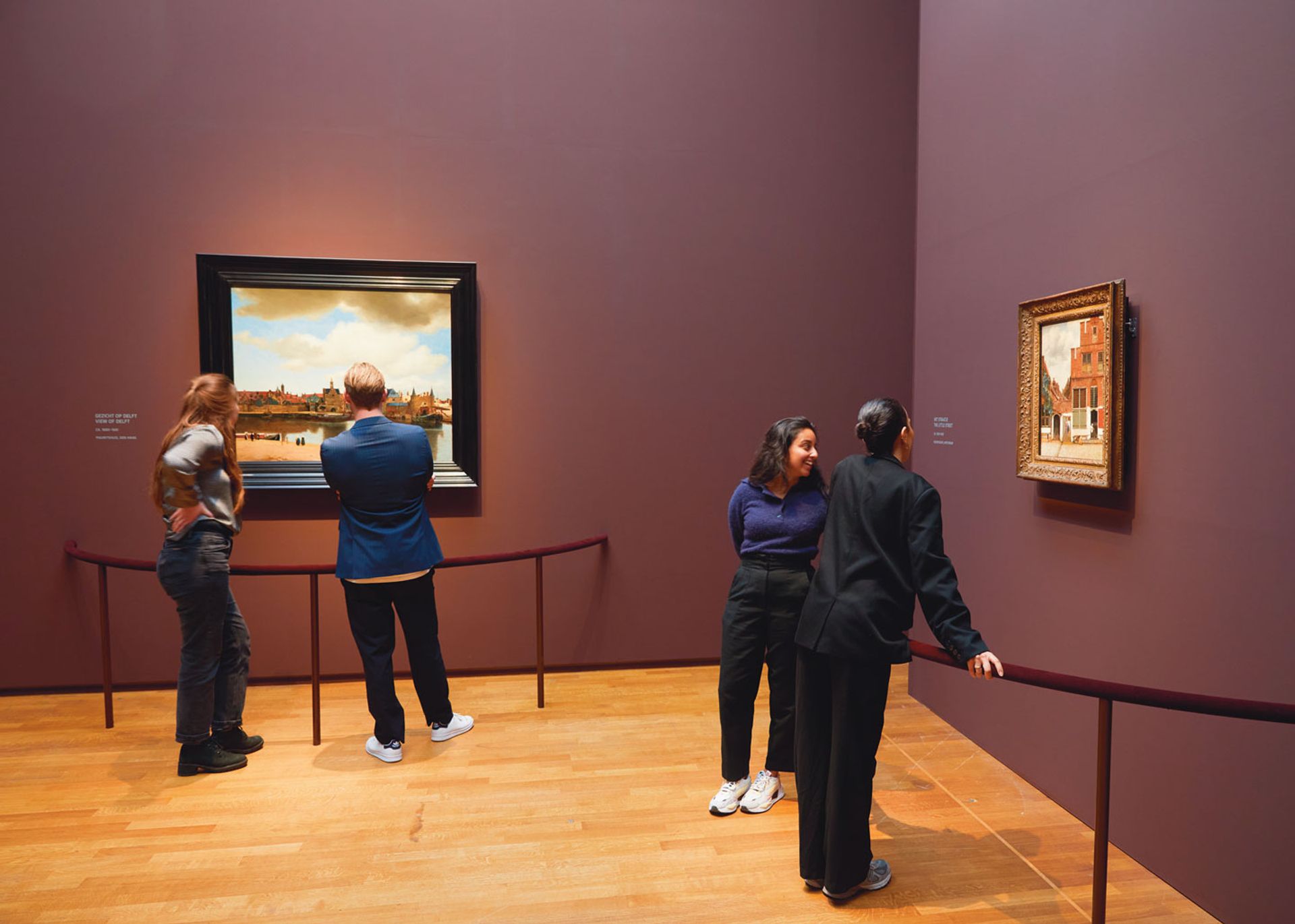 Visitors to the exhibition can lean on velvet covered barriers to take a closer look at masterpieces such as View of Delft (1660-61), left, and The Little Street (1658-59)