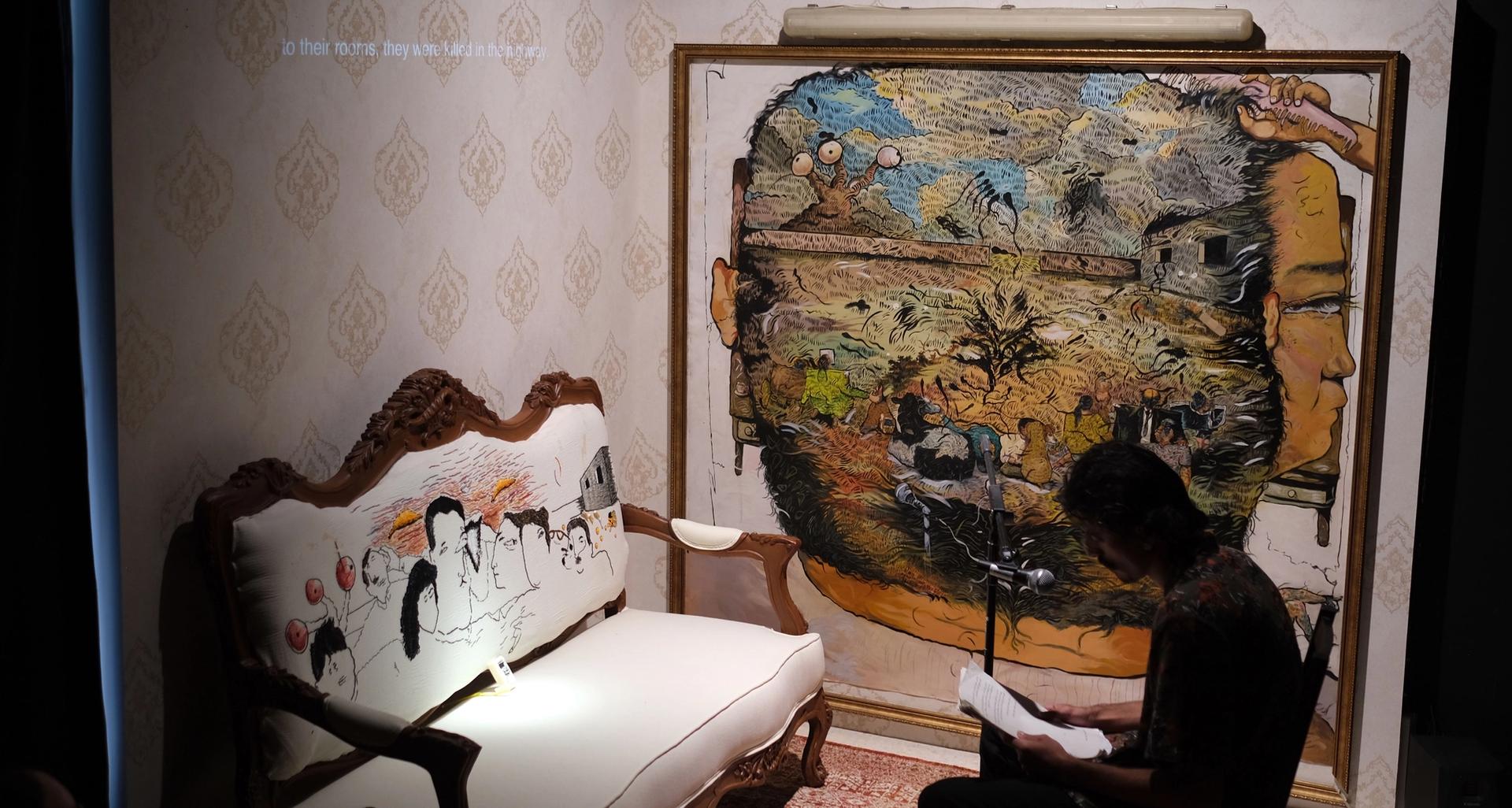 Also taking us back to rural Iraq was Ali Eyal’s literary performance in Arabic, Don't let the beautiful colors fool you, who would draw Goofy inside the rooms of grownups? (2021), in which the artist employs fiction as a tool to share stories of detainment, violence and becoming an artist in a room-sized installation of found objects, paintings and a couch. In The Search for Power, Tania El Khoury transports the audience to Beirut, where a power cut at her wedding led us on a participatory journey through archives that revealed electricity shortages in Lebanon dating from the 1950s (pre-civil war) and a complex web of foreign aid and corruption.