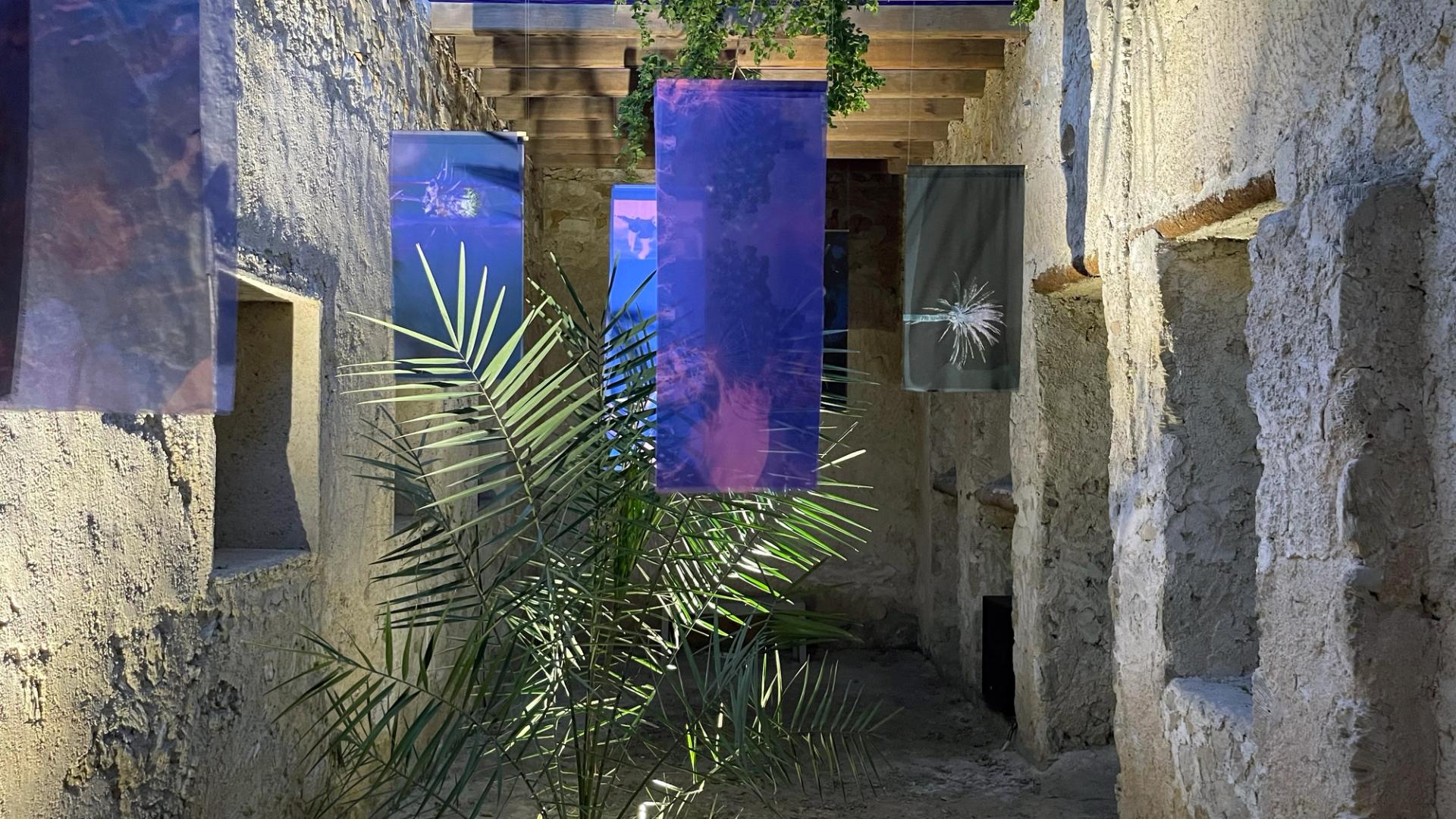 The longstanding relationships the Sharjah Art Foundation has with artists was demonstrated in generous site-specific commissions. For example, Basel Abbas and Ruanne Abou-Rahme's Until we became fire and fire us (2023)—a lyrical and fragmented multi-screen projection on the Palestinian condition—is dispersed across space in the ruins of the old house Bait Haider Abadi, a formation that adheres to their expressions of uprooting. Mirna Bamieh’s takeover of a large swathe of the abandoned Old Jubail Vegetable Market, entitled Sour Things (2023), is a luscious presentation of dainty ceramics, where silver-nailed fingers hold recipes and writings on a long table candlelit setting that is flanked by stalls of fermented fruits and mouldy lemons.