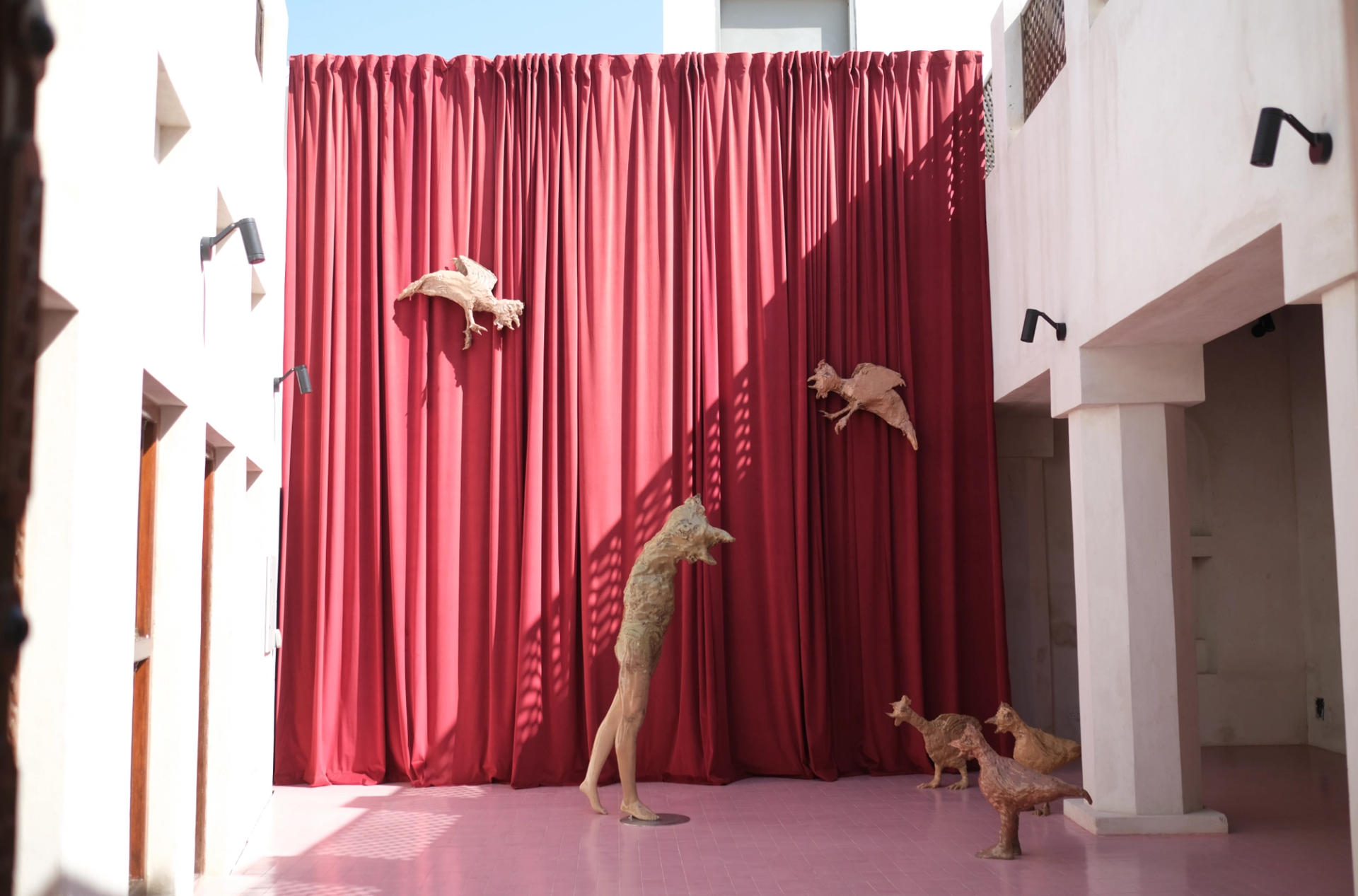 Positioned near Mame-Diarra Niang's abstract photographs of diffuse Black portraits melting into brightly coloured backgrounds, entitled Léthé (2021), and Jawad Al Malhi’s saturated portrayals of solitary figures and groups in Palestine washed over with greyish-white paint, these formalist tropes present a kind of indeterminacy. Perhaps most unsettling of these are Destiny Deacon’s close-ups of Black and Aboriginal dolls with their faces cut out, entitled Smile (2017). Nearby in Al Mureijah Square were other transmutations in 3D with Emirati artist Maitha Abdalla’s expansive installation of hybrid half-human figures harbouring dark, religious and mythological connotations. In her haunting video, Under the Sheets (2023), she performs with a dancer donning a pig’s head.