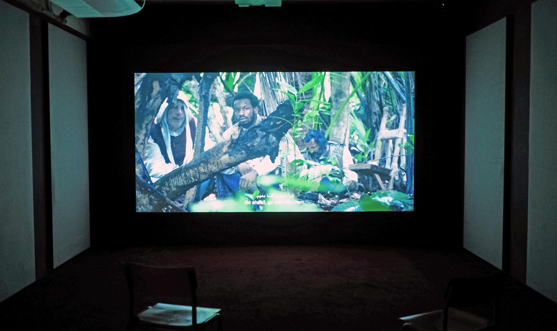 Some of the most captivating works are satirical films with a clear beginning, middle and end, such as Adam Khalil's collaboration with Bayley Sweitzer and Oba, Nosferasta: First Bite (2021), a vampire film with psychedelic visuals. This allegory for US hegemony through the eyes of a precarious Rastafarian immigrant allegedly bit by Christopher Columbus is unexpectedly linked to Farah Al Qasimi's film, Um Al Dhabab (Mother of Fog, 2023) in magical realism. Creatively rendered in TikTok graphics and ornate floral interiors often matching the actresses' clothing, Al Qasimi explores 17th-century myths of the Gulf through the ghost of a pirate whose remains will be displaced by a new luxury development that includes a casino—the sign of liberalism through capital.