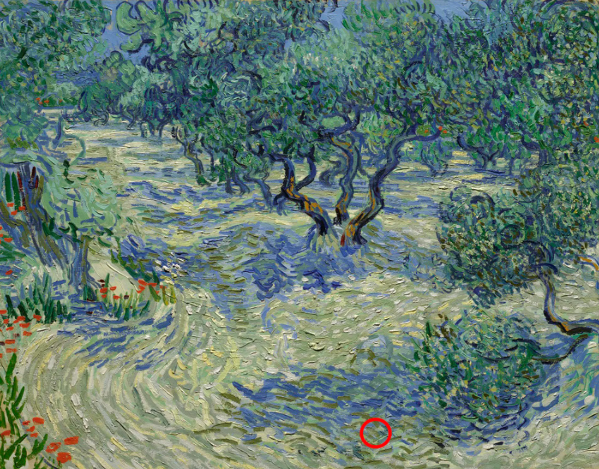 Our readers love art stories about animals, but insects seem to be equally noteworthy when they get caught in Van Gogh’s impasto paint. The remains of a grasshopper were found embedded in Olive Trees (June-September 1889, now at the Nelson Atkins Museum of Art, Kansas City), providing further evidence that this composition was painted outdoors in a grove rather than back in the artist’s studio.
