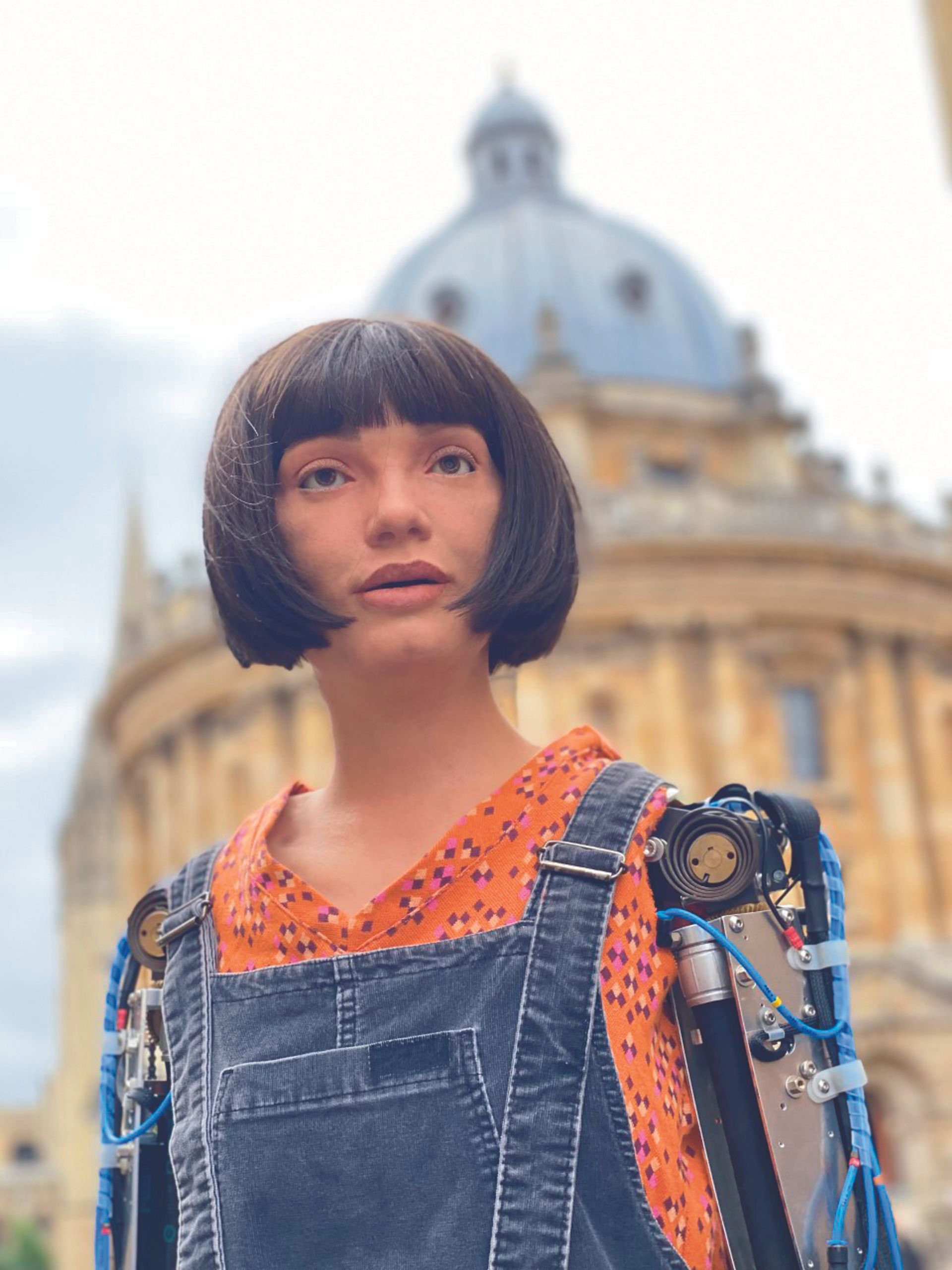Ai-Da standing outside the Radcliffe Camera in Oxford