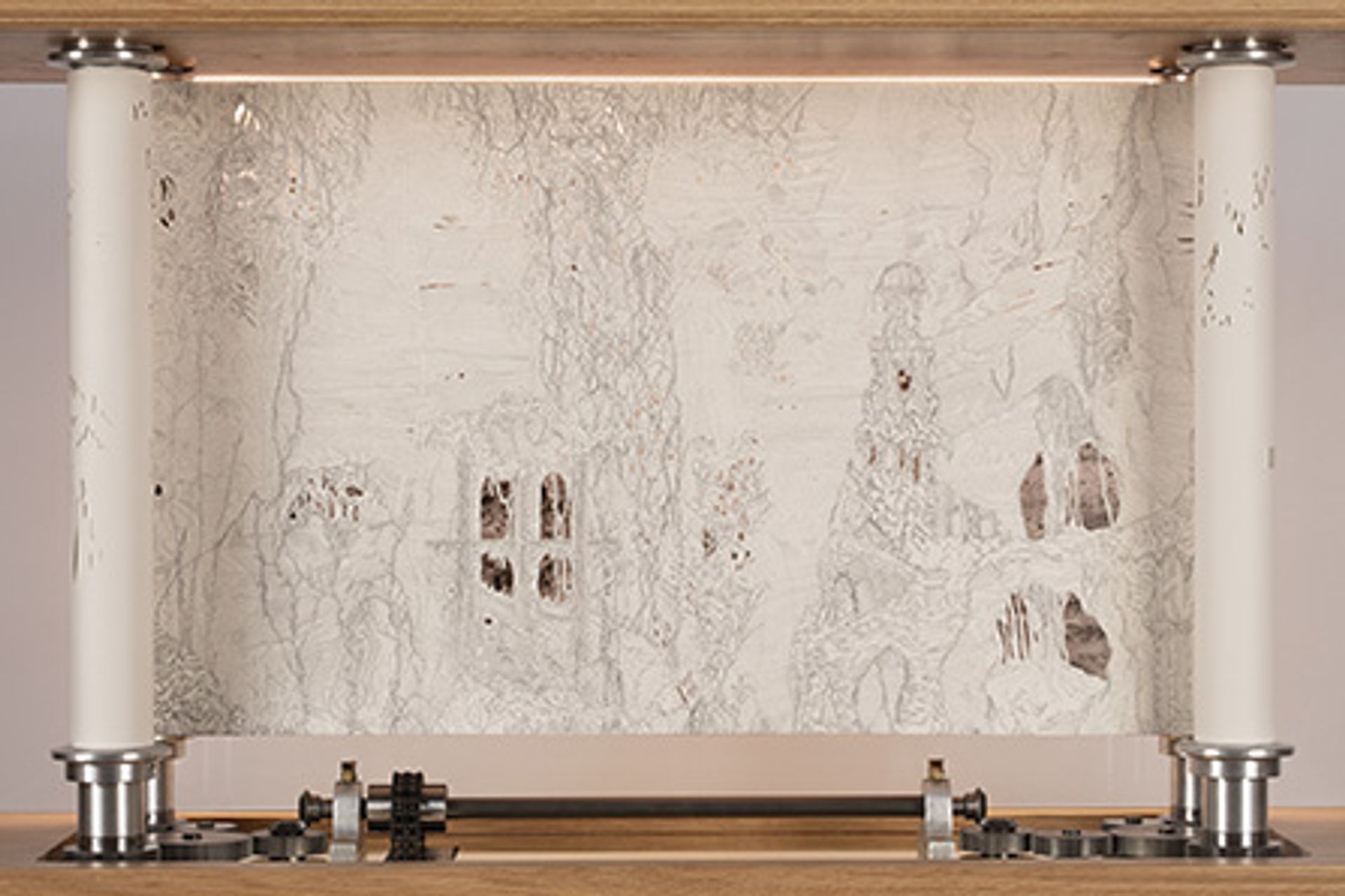 Jospin also evokes the cartography of the area through a series of relief drawings on mounted canvas displayed at the Carreau du Temple along with landscape-like embroideries made from silk threads. All of these elements pivot around a carmontelle, a roll of paper stretched between two cylinders that unfurls with the turn of a handle. The device is named after Louis Carrogis Carmontelle, the 18th-century set designer; Jospin’s version reveals a panorama of trees and vines reflecting further her Ruinart experience.