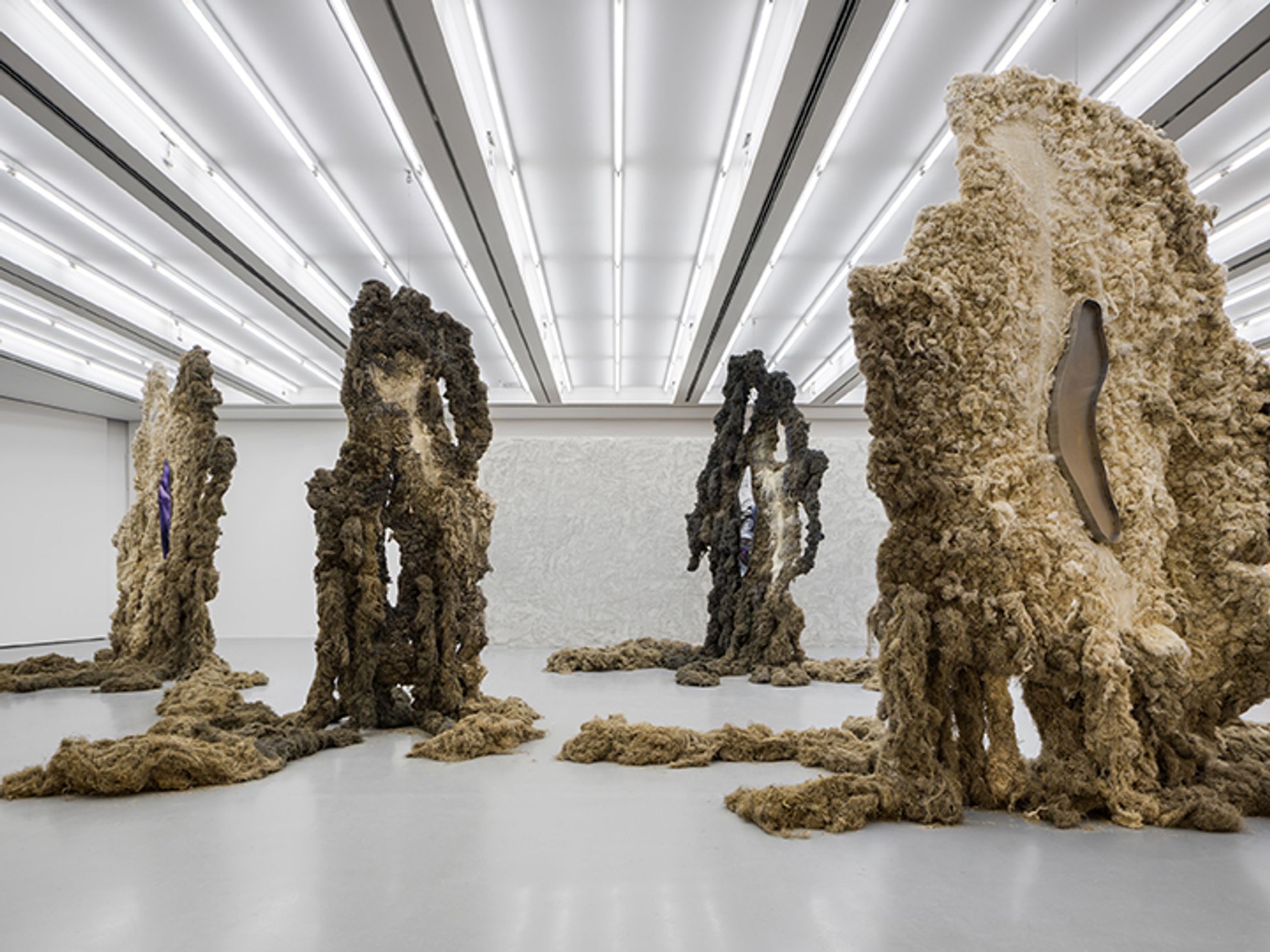 In the two galleries that were the main pool, Hosnedlová, who recently joined White Cube gallery, presents a pair of installations. On the ground floor, large suspended organic sculptures with exposed tapestry structures like the skeletons of ossified pupae hang like animal carcasses in an abattoir. At the centre of each is a small, exquisite fragment of a sculpted woman, housed within a stainless-steel container reminiscent of a surgical kidney dish. The pictures are embroidered, and their ultra-fine silk threads give the painterly impression of brushstrokes. The wool and linen sculptures are thick and sensual, and the room smells strongly of organic matter. In corners and on the stairs leading to the upper gallery lie piles of wool, as if discarded by those who displayed the once-living objects, or shed by the cocoons themselves. A single small image of a snake is hidden at the end of a long corridor illuminated by yellow fluorescent tubes.