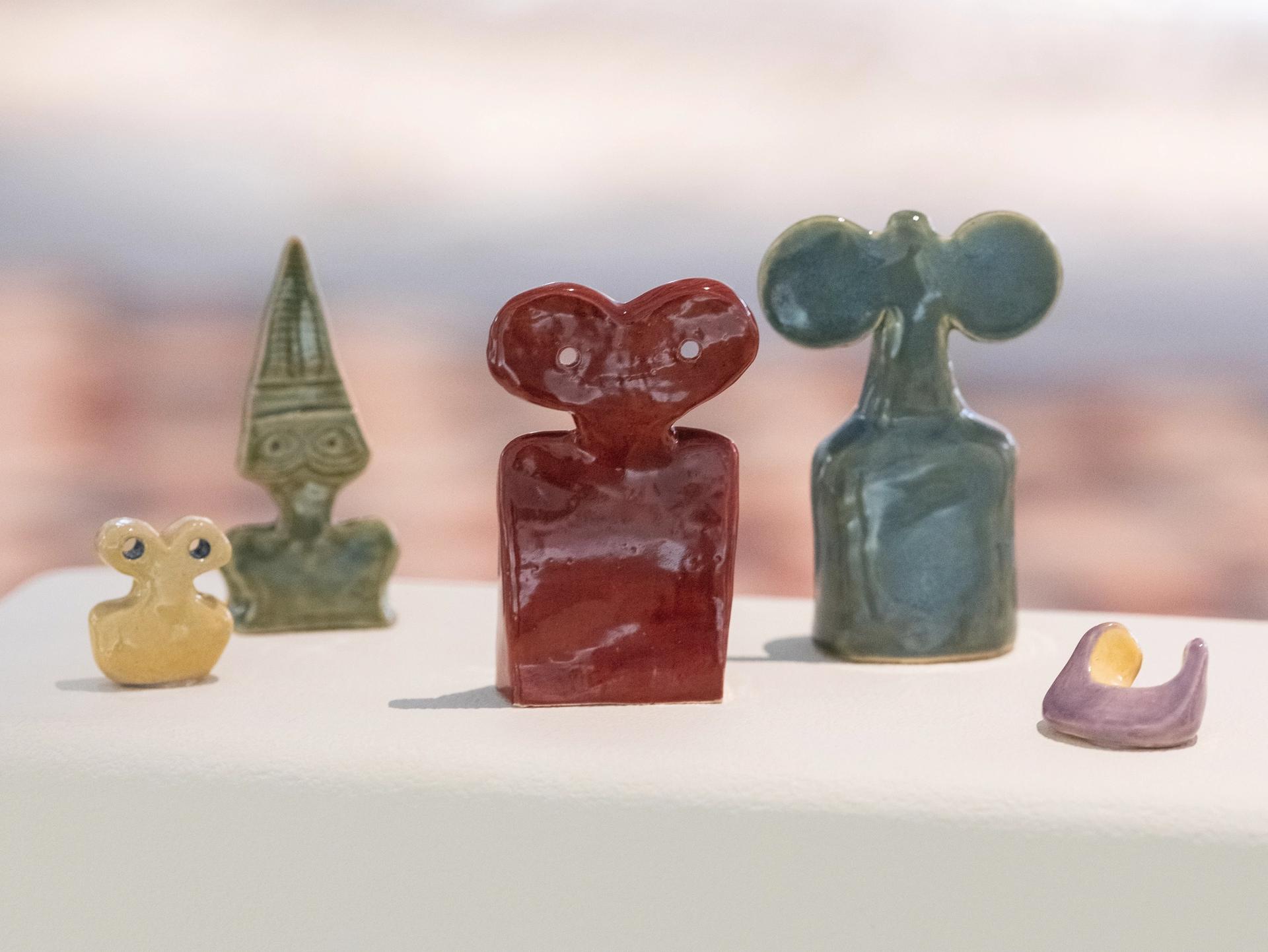 Rand Abdul Jabbar’s work Earthly Wonders, Celestial Beings is a collection of 100 handmade clay objects which echo forms from ancient Mesopotamia. Some mimic an object in its totality, while others show a small detail from a relief or piece of sculpture. “A lot of my work engages with historic accounts and memory—the tangible remains of history and the more ephemeral remains.”