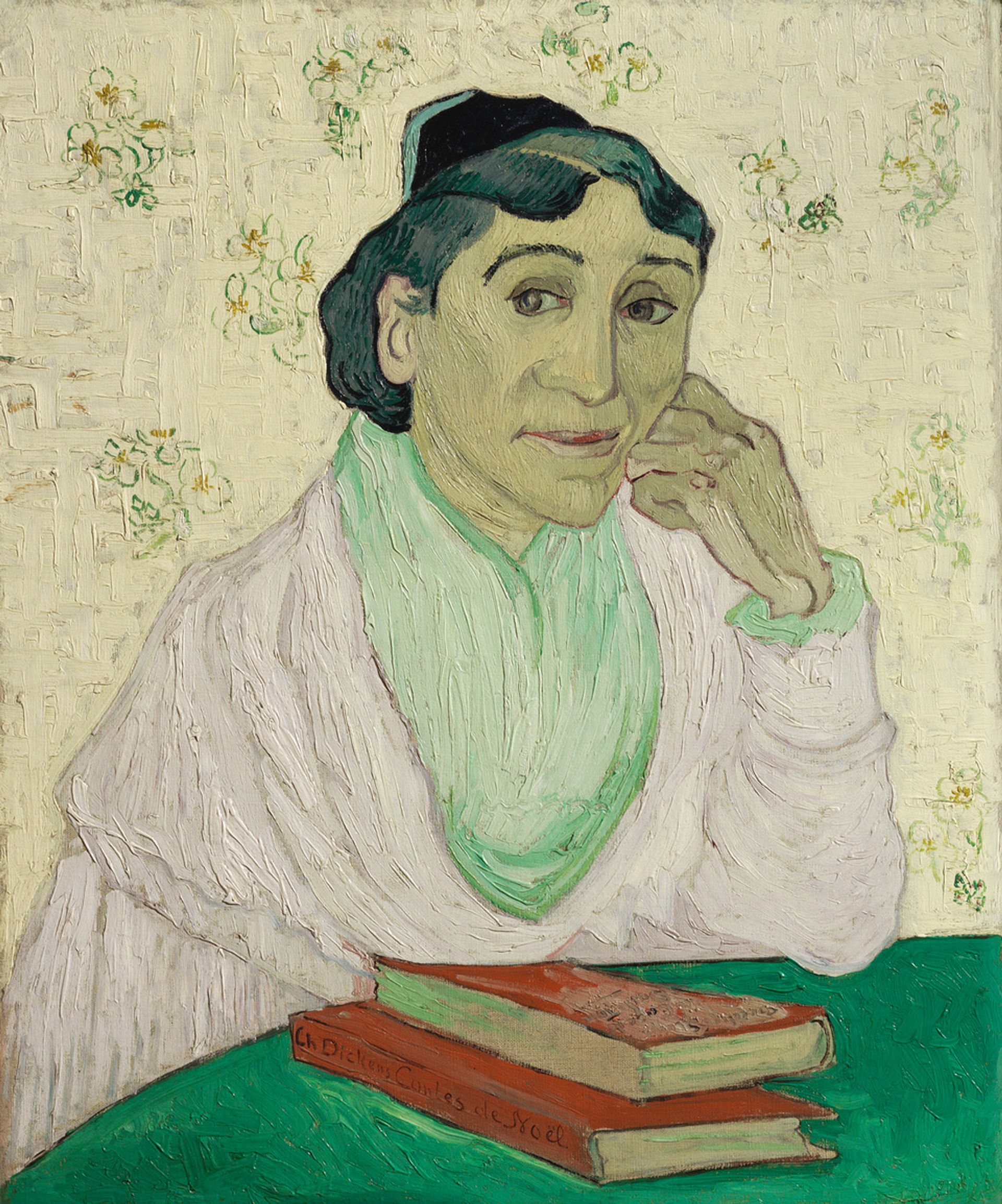 Woman from Arles (February 1890) is based on a portrait drawing by Paul Gauguin of their mutual friend Marie Ginoux, the proprietress of the Café de la Gare, which was almost next to the Yellow House in Arles. The two books on the table in front of her are French editions of Harriet Beecher Stowe’s Uncle Tom’s Cabin and Dickens’s Christmas Tales, both of which Van Gogh admired.