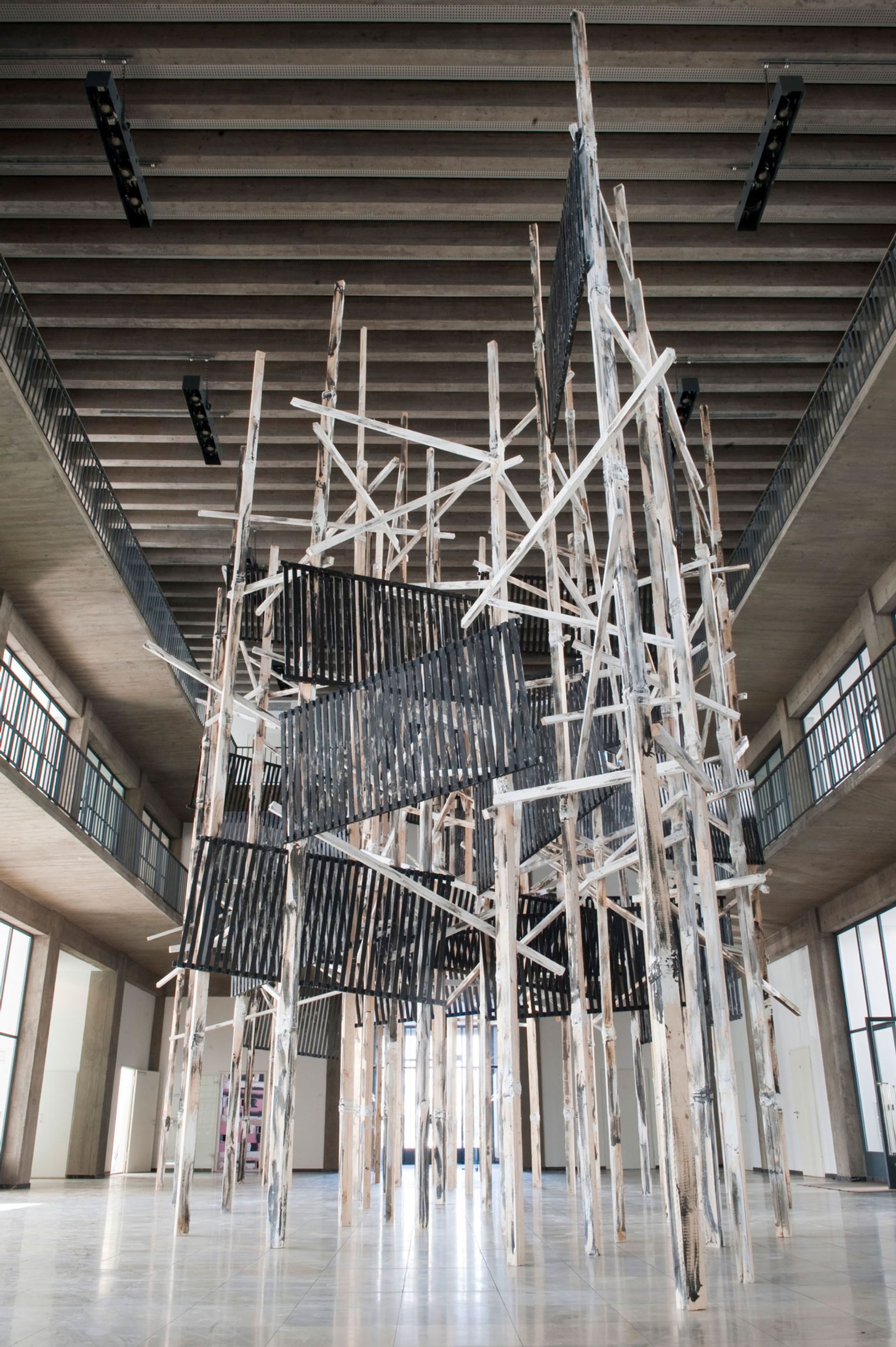 This was evident in an extraordinary series of works made in the 2010s, from Tip (2013), a forest of cement, timber, steel mesh and fabrics that flowed out from the Carnegie Museum of Art in Pittsburgh, to dock, her show cramming into the Duveen Galleries at Tate Britain in 2014, and, perhaps most notably, her 2017 work folly, filling seemingly every inch of the British pavilion at the Venice Biennale. In each case, she took on loaded spaces: the ghosts of artists past at the Carnegie and Tate, the national pavilion of Britain in the year after Brexit—an event that appalled her—with characteristic boldness and risk.
