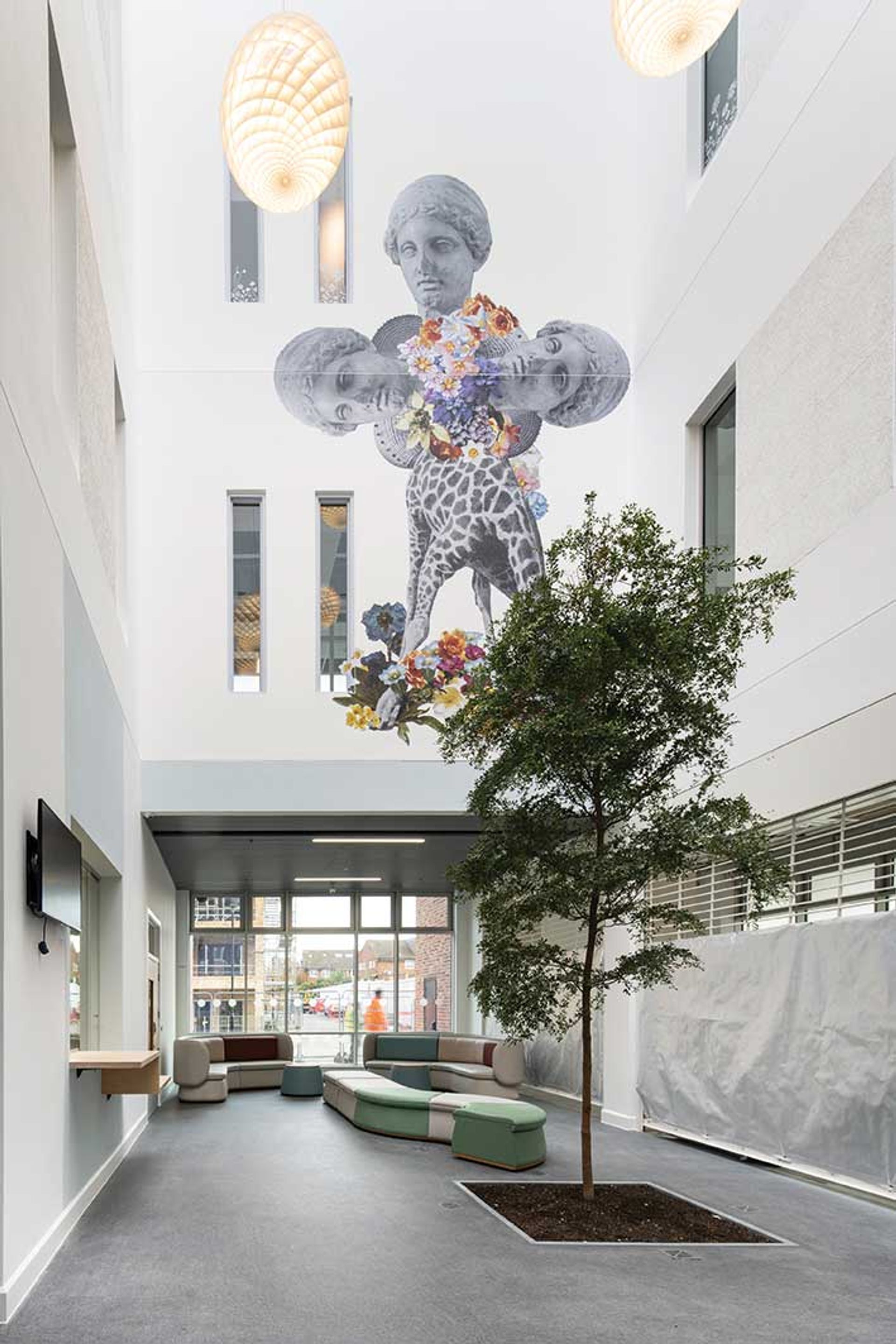 Harold Offeh worked with Springfield patients to make individual clay tiles inspired by their personal and cultural experiences, which punctuate his mural work in the Trinity Recovery College. Nearby another tall, light-drenched hallway is emblazoned with Yinka Ilori’s vivid rainbow billboard declaring, “Hope for A Better Tomorrow”. For the third of Springfield’s three-storey internal atria, Sutapa Biswas has created a stylised night sky influenced by Giotto’s 14th-century Scrovegni Chapel, in which an entire wall is painted ultramarine blue and emblazoned with a cascading waterfall of gold-leaf stars. In the multifaith room Abbas Zahedi, who won the 2022 Frieze Artist Award, gives an abstract stained-glass effect by covering the windows and skylights in semi-transparent vinyls printed with marbleised patterns.