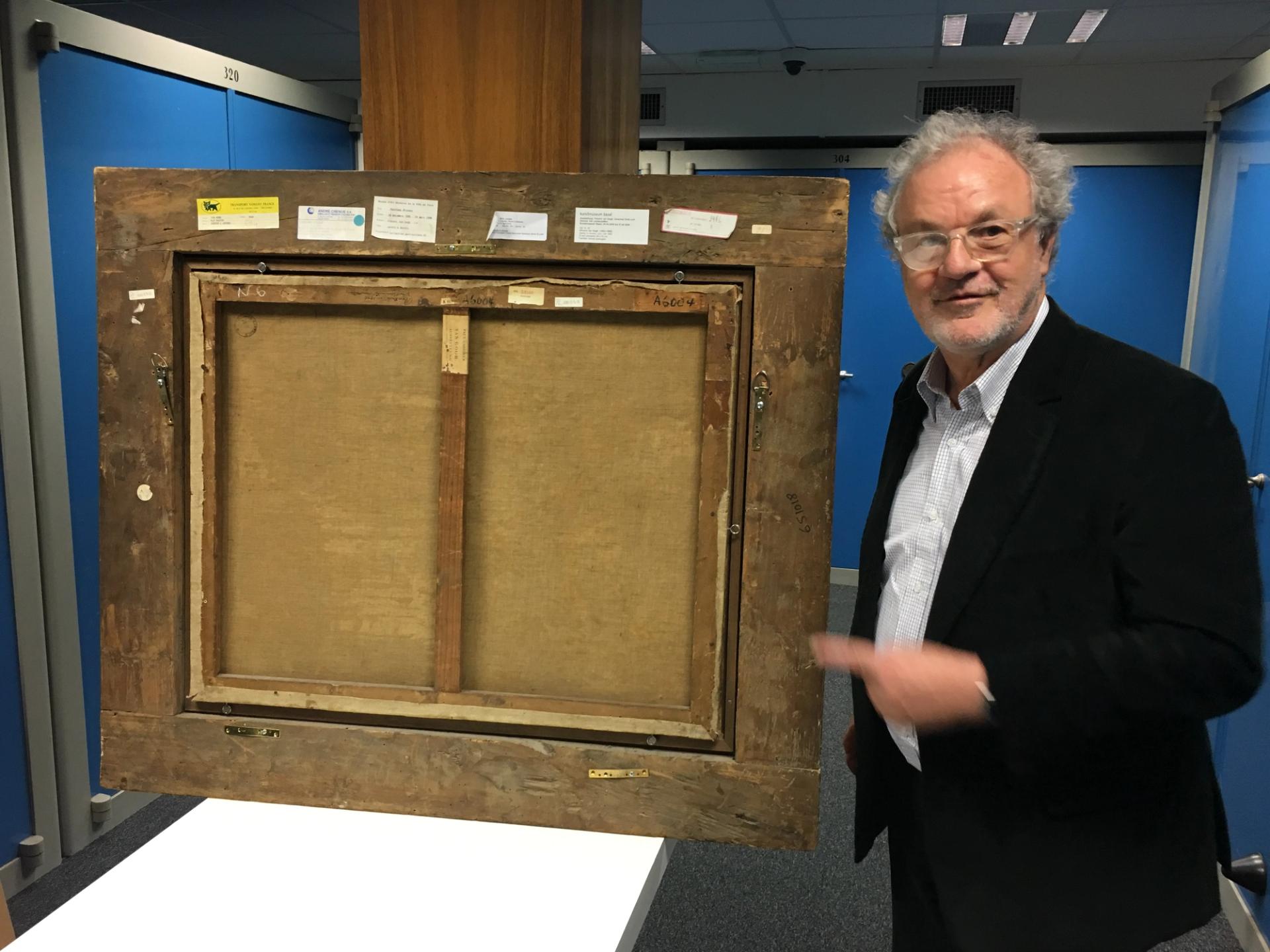 Janssens with the reverse of Garden at Auvers, showing the wooden stretcher and frame