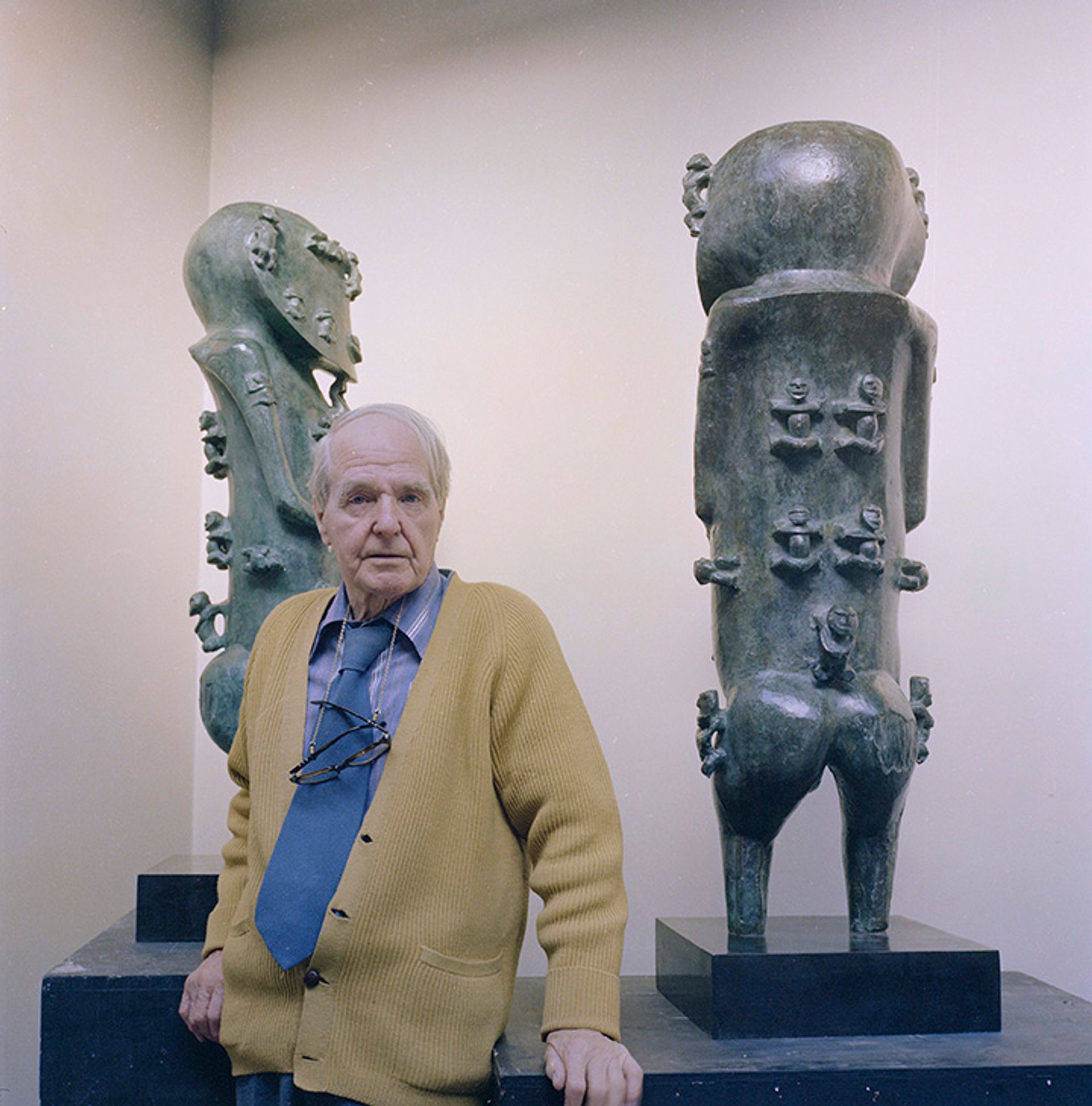 Henry Moore with a cast of A’a, which was given to him on his 80th birthday by the British Museum Photo: Errol Jackson. Reproduced by permission of the Henry Moore Foundation