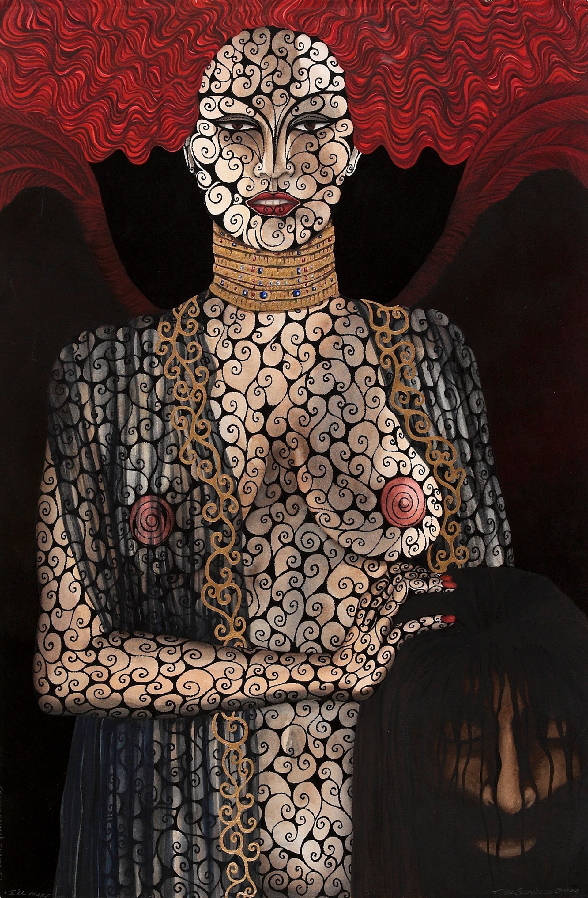 The most recent work in the Minneapolis exhibition, by Tina Blondell, I’ll Make You Shorter by a Head (1999), shows a frontal, bare-breasted, sexy Judith holding Holofernes’s head. “The title suggests her view through a female lens, giving the woman agency,” McGarry says.