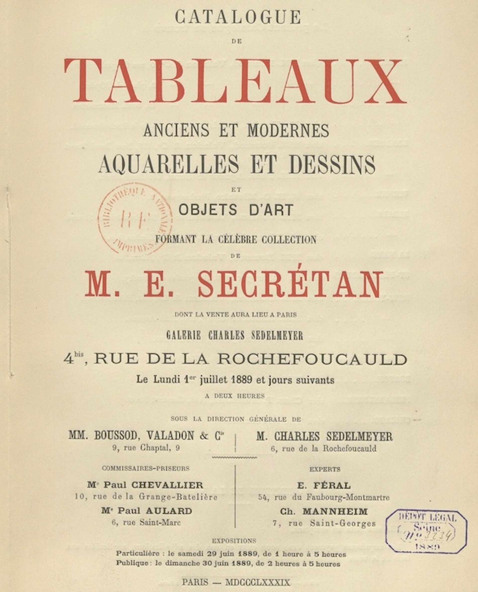 In July 1889 Boussod & Valadon was one of the two firms involved in the auction of the famed collection of Etienne Secrétan, the wealthy owner of a copper foundry. The sale was held at the Charles Sedelmeyer gallery, but with assistance from Boussod & Valadon, as it recorded on the cover of the catalogue.