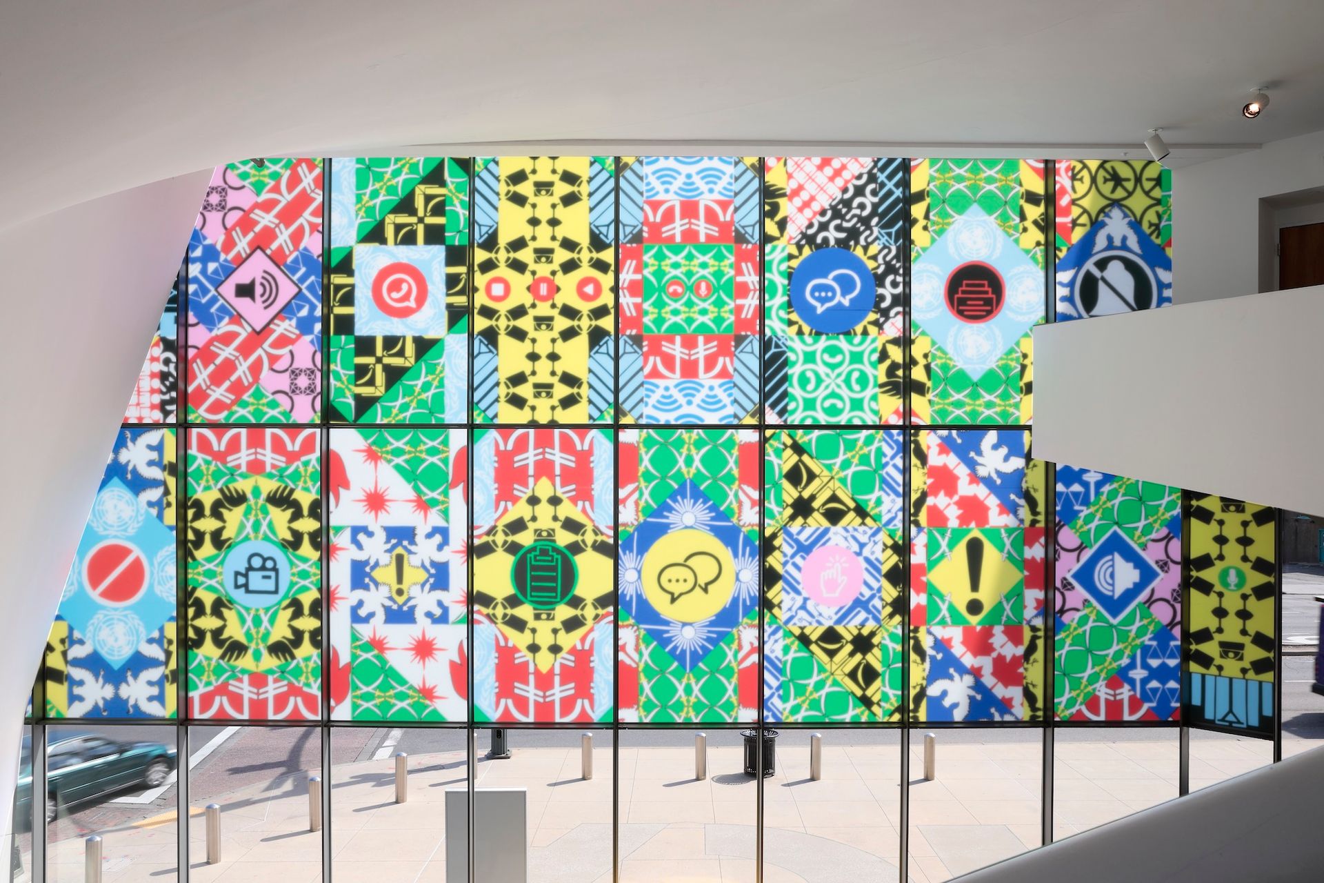 Commissioned by the Institute for Contemporary Art (ICA) at Virginia Commonwealth University, the work, McLean (2023), by Navine G. Dossos, covers a large section of the ICA’s panelled façade. It is composed of vinyl that showcases bold patterns and symbols arranged in a grid, evoking a zany quilt or tiled flooring. The symbols, ranging from a video camera to a diamond ring, allude to aspects of Khashoggi’s life.