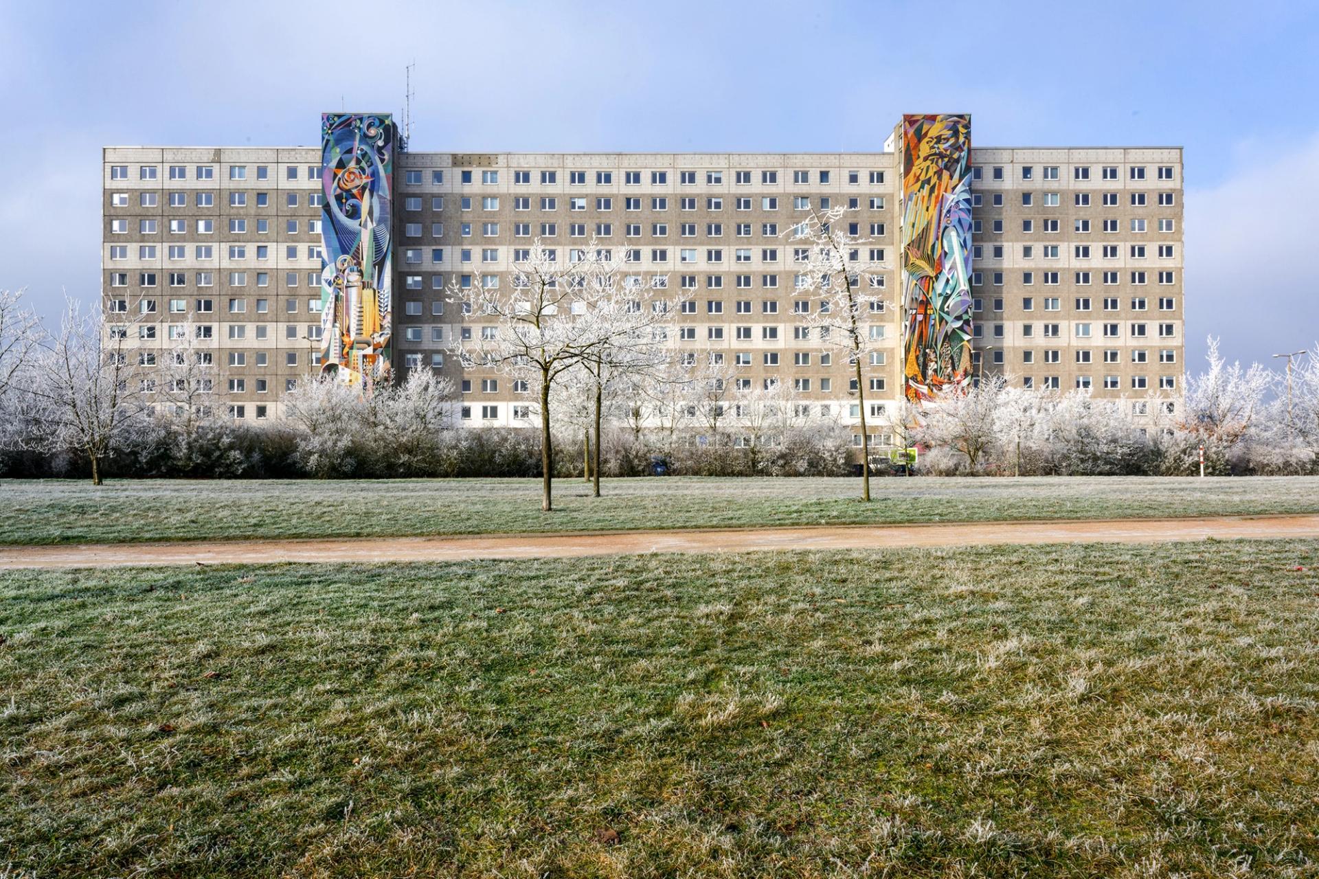 The mural, by Josep Renau, was completed in 1974 on the external wall of the stairwell of an 11-floor residence for apprentices in Halle-Neustadt, a concrete new town built near the city of Halle during the Cold War to house workers at nearby chemical plants. Since the fall of the Berlin Wall, Halle-Neustadt’s population has dwindled to around 45,000—approximately half its peak in the 1960s.