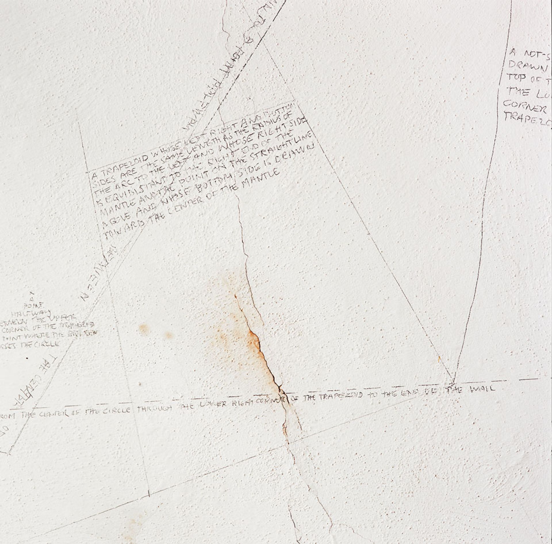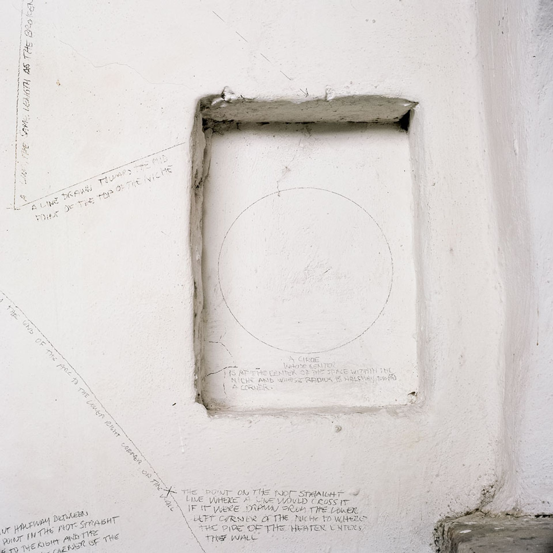 In 1976, Sol LeWitt produced a group of wall drawings in the Vecchia Torre, a medieval tower in the Umbrian town of Spoleto, Italy. They comprise an elaborate series of line, shape, and word drawings, three grids in which different combinations of geometric figures are exhausted, and a statement that reads, tautologically, “ON THIS WALL ONE FINDS THIS WRITING.”