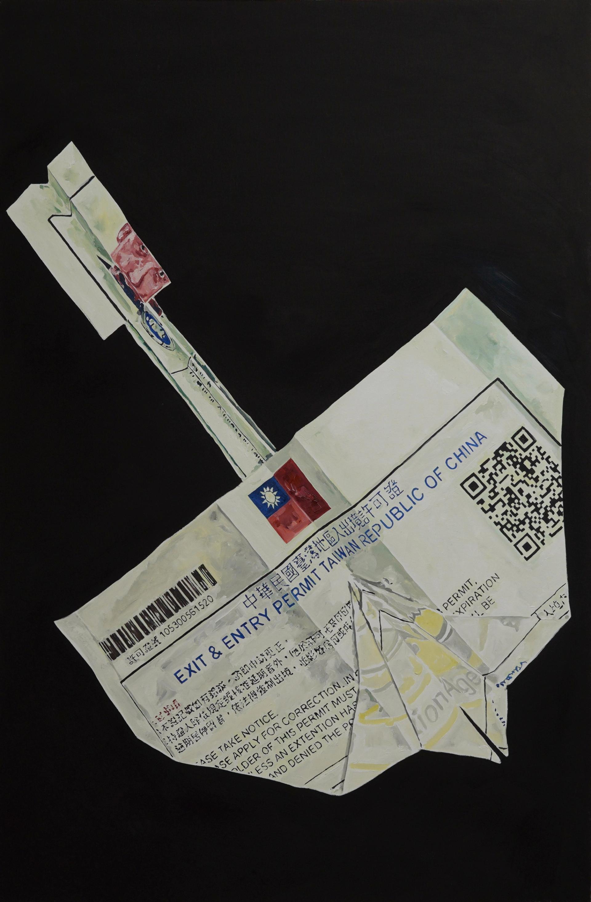Painting dominates the fair hall, with modern and contemporary ink works nodding to the Taiwanese appreciation of Asian traditional forms. From Hong Kong, Lucie Chang Fine Arts have brought the prominent protest street calligraphy of the late outsider artist Tsang Tsou-Choi—better known as the "King of Kowloon"—and Hanart TZ, also from Hong Kong, brought works by the critically overlooked late ink master Yeh Shih-Chiang, plus photographer Yeh Weili’s documentation and book about the painter. At Galerie du Monde, the charged politics of Greater China find expression in Tang Kwong San's 2023 painting Paper Airplanes, about a Hongkonger dreaming of an elusive migration visa to Taiwan, and Guanyu Xu's 2022 photograph RK-08282018-01142022, part his Resident Aliens series about Chinese nationals who got stuck abroad during the pandemic years.