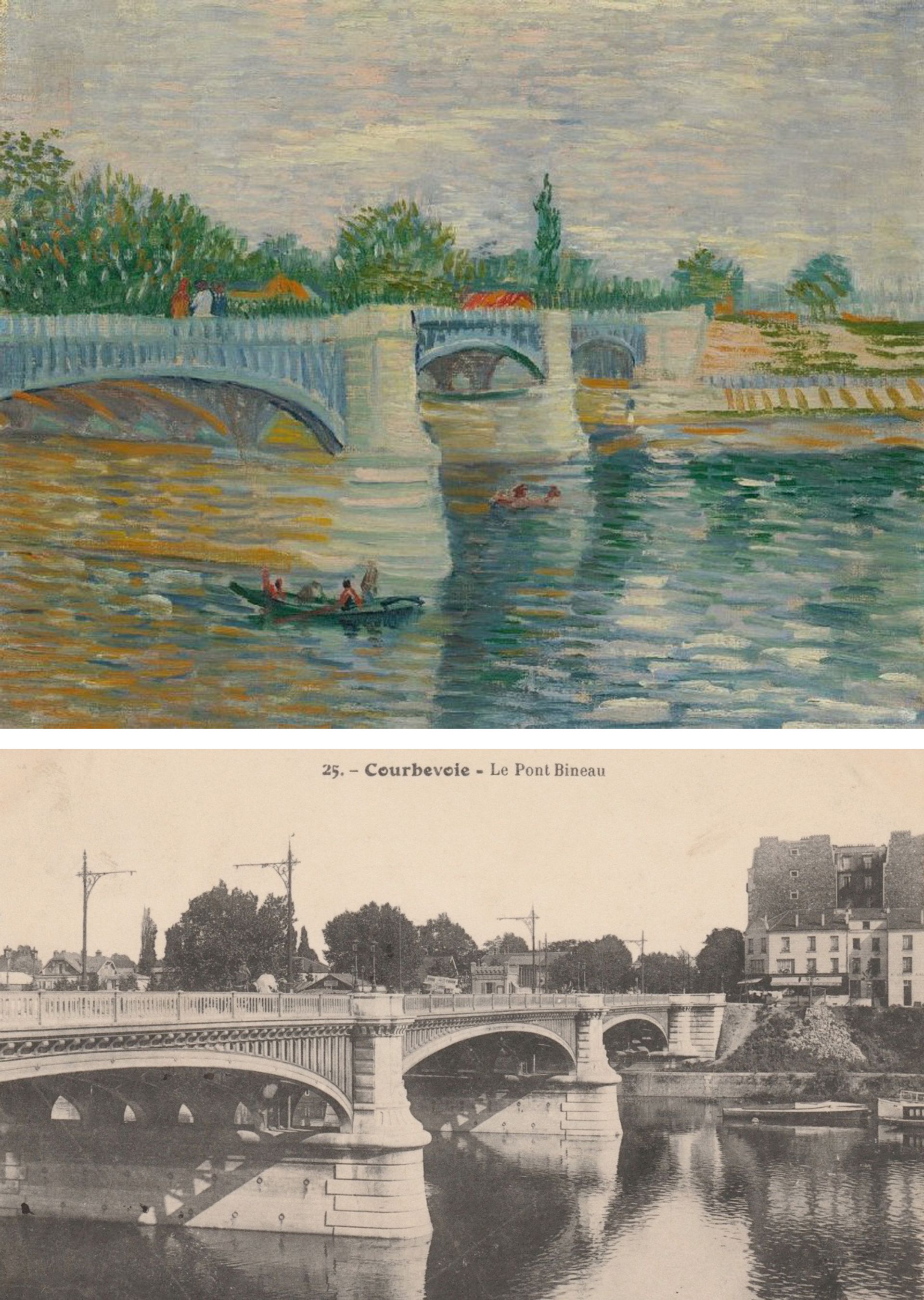 Van Gogh’s The Bridge at Courbevoie (May-July 1887) / Courbevoie - the Bineau Bridge (postcard) (around 1910)